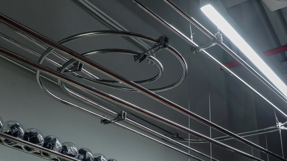 前台区域的设计以售卖“扭蛋”的货架悬挂于吧台上方,制造有趣的观看和等待行为。货架以滚球轨道为原型,以验证过的坡度、弧度实现扭蛋从高处滚下。目的在于取代静态的陈列方式,将传统售卖转变为一个可观赏的互动体验过程。