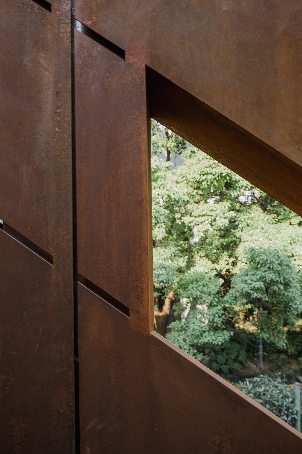 新馆造型,采用了耐候钢板塑造的一组错动的立方体组合,利用结构内退四面悬挑的方式,既强化了体量的沉稳刚毅,又表现了形体组合的错落灵动,与红锈色的质感共同隐喻了党领导下的中国工人运动的曲折、壮烈与坚毅。