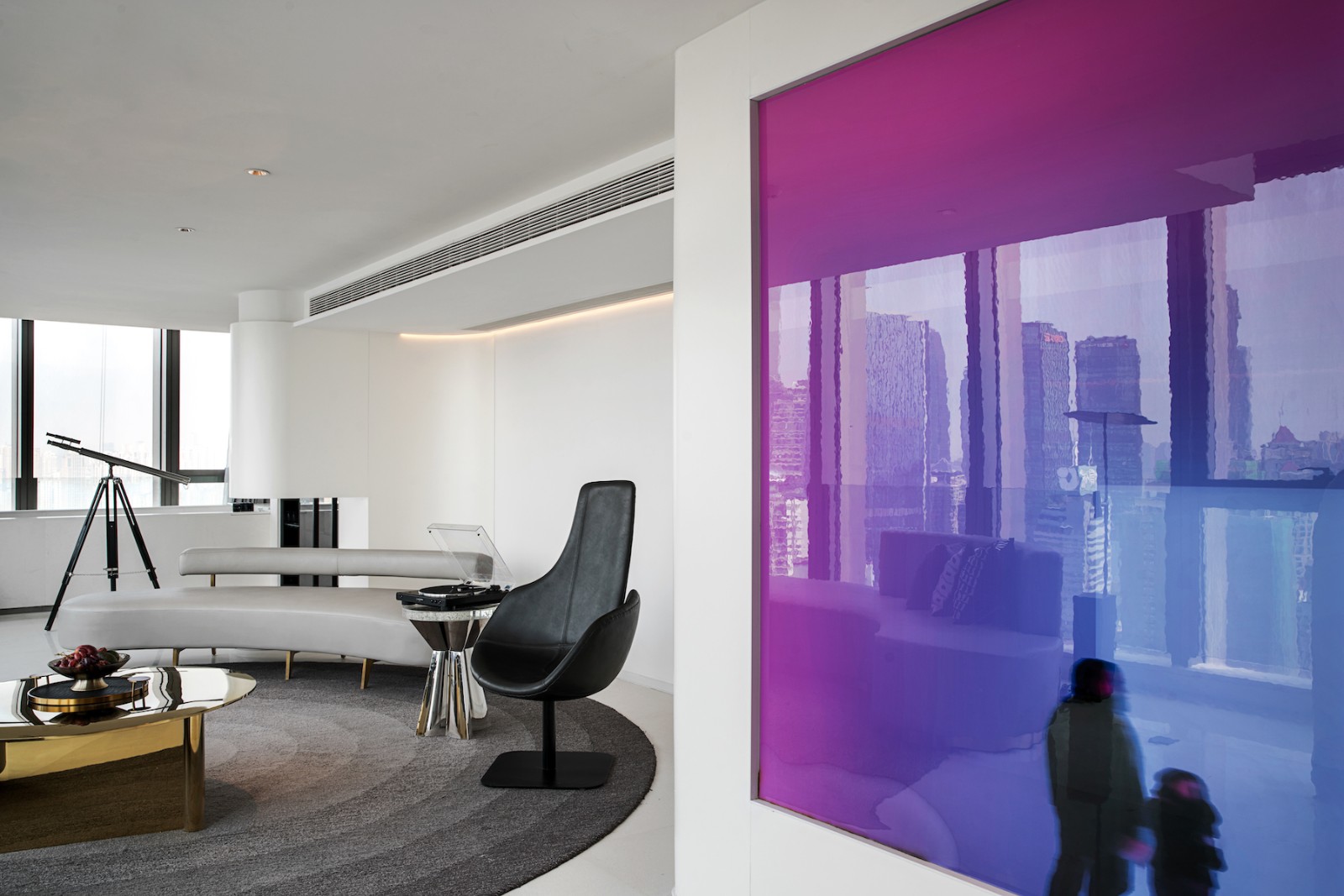 位于30楼的接待大厅,层高近10米,以城市天际线为背景的接待台低调简练,除去漂浮在大厅的几朵“云”(主题艺术座椅)以外,空间几乎全部留给客户,拍照、踱步、远眺、呆坐…