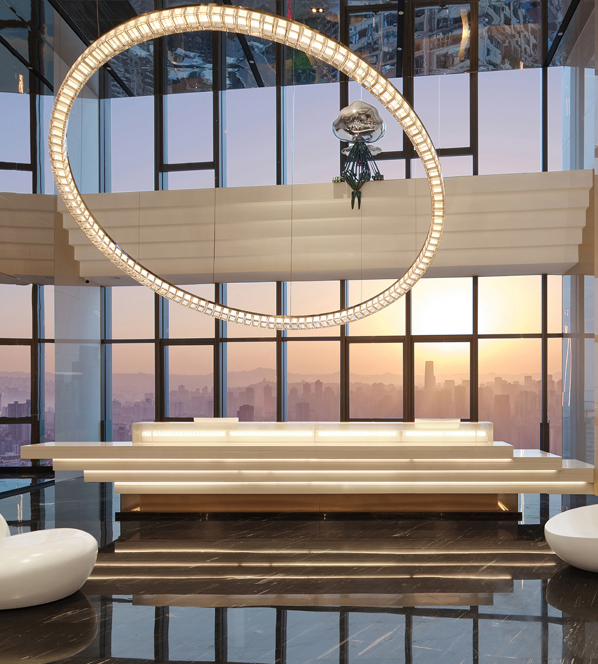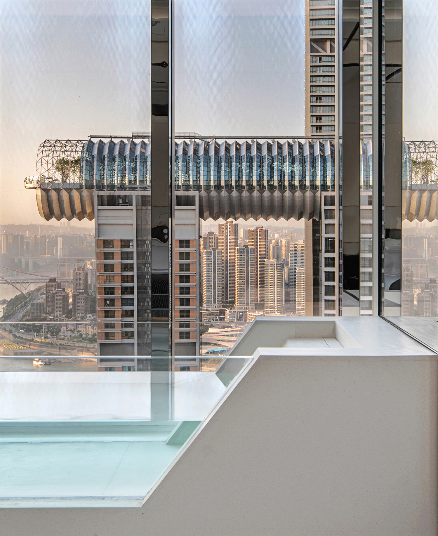 阳光穿过落地窗,洒进大堂,映照在墙面,城市和江水倒映在天花上;悬挑的飞梯,穿墙而出的健身长廊,定格高空浮云的观景台,都隐喻着山城的DNA,一座魔幻奇趣的立体城市。