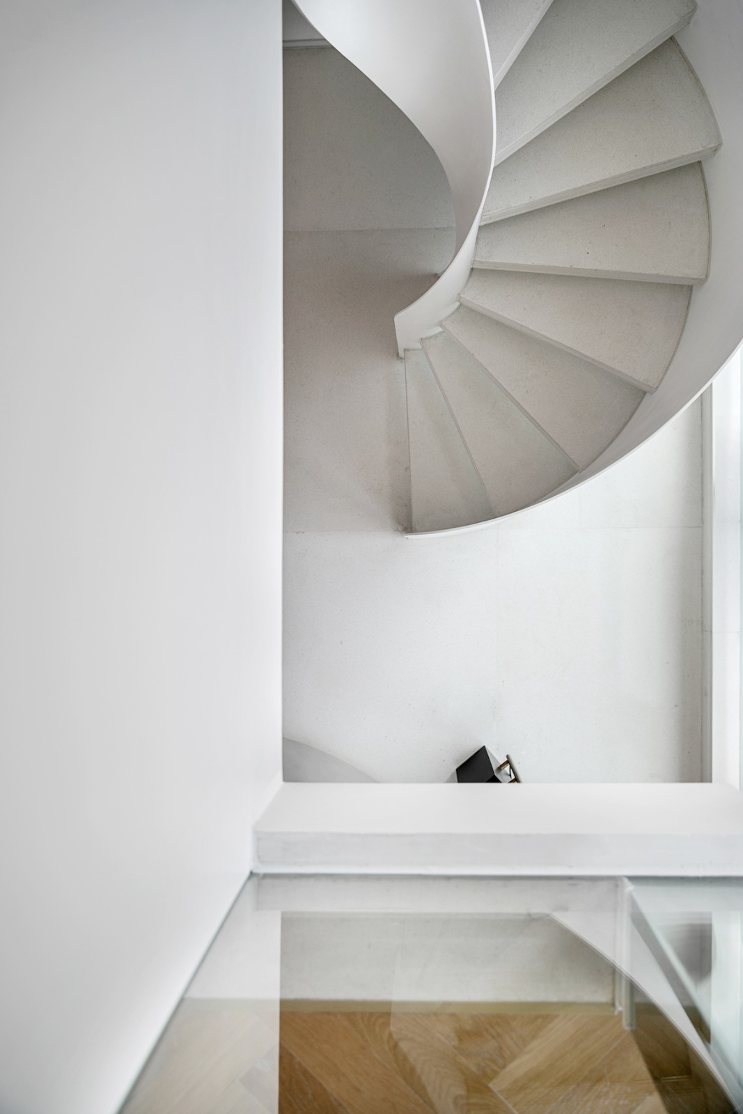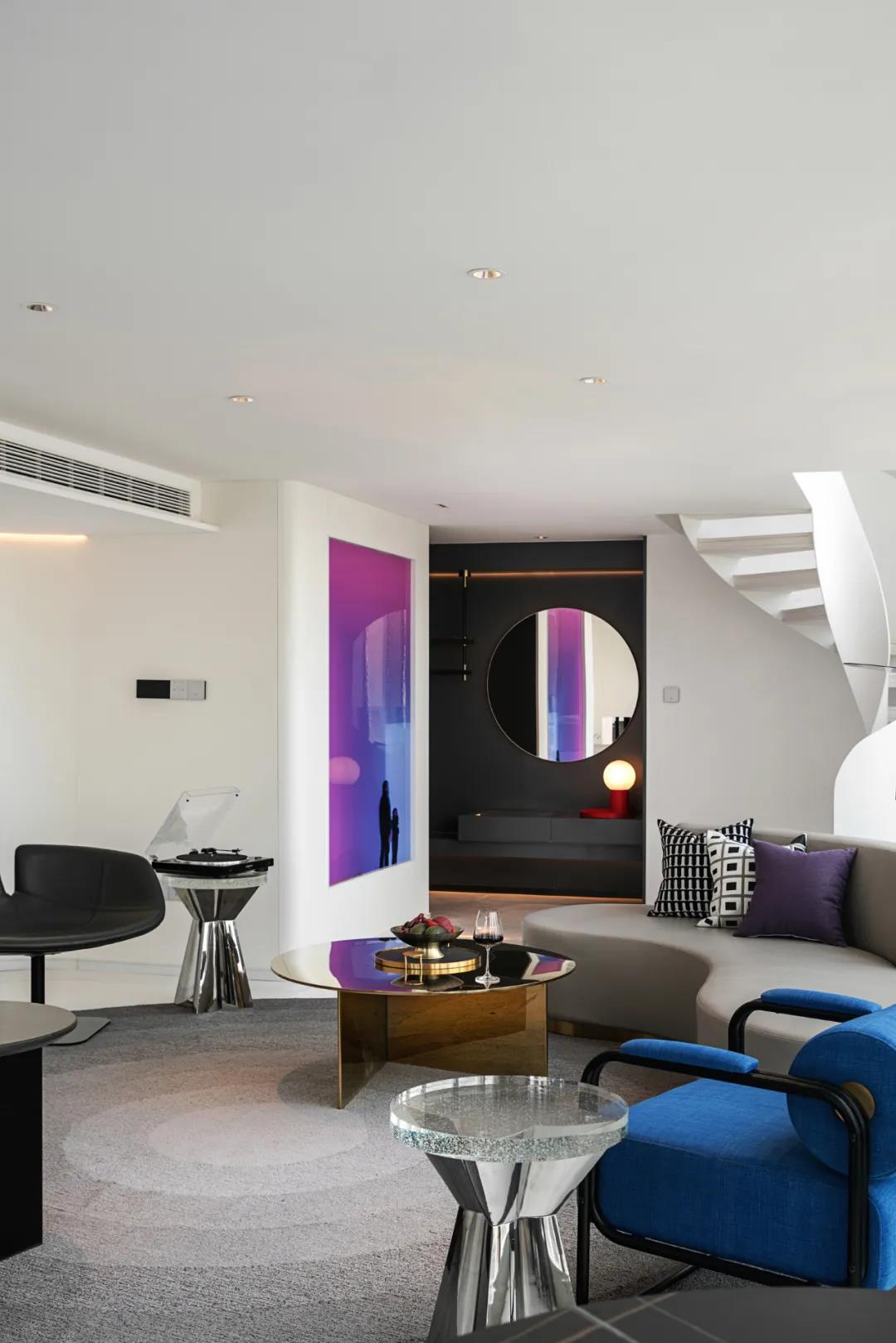 大堂借助飞梯与健身长廊连接,飞梯盘旋穿插与空间上下,为客人提供了更多的互动视角。
