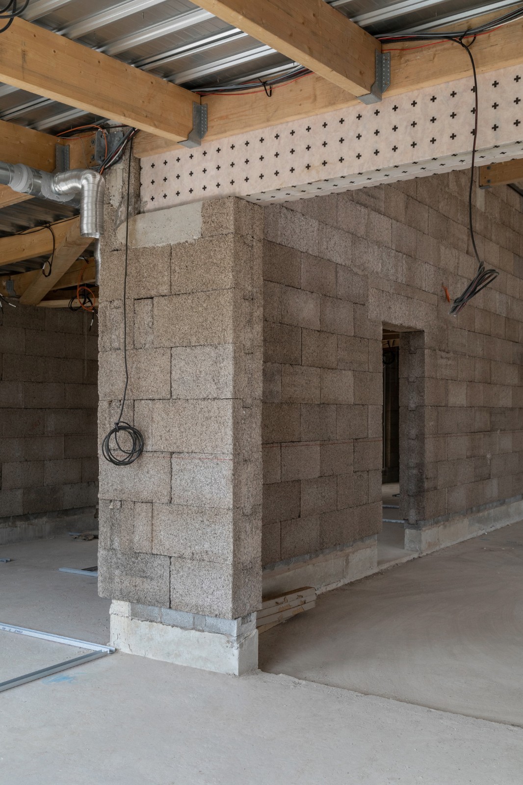目前,大麻主要用于独立式住宅,通常在外部采用石膏饰面进行处理。在本项目中,为了便于维护,外立面由可以被单独更换的面板覆盖。内表面的下部用石膏对大麻材料进行处理。上部的大麻混凝土块被暴露在外,以此保留其良好的声学性能。