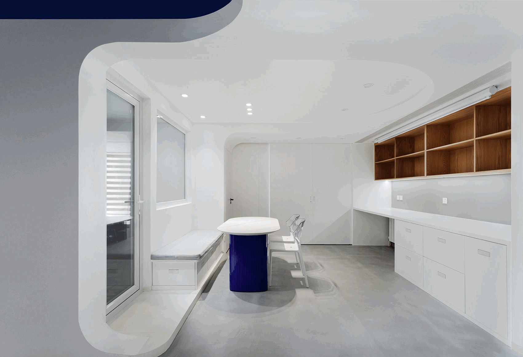 灰色的树脂地面和顶面的流线型,巧妙地划分出客厅边界。阳光从窗口射入,大面积的白,点缀克莱茵蓝、木色、浅灰色,让客厅空间十分明亮舒适。卡座下方同样可以收纳,减少暴露生活中产生的零碎。餐桌可以完美地移动到书桌下方,为空间提供了另一种变换的可能。可以在空旷的客厅玩音乐,和小孩子玩游戏,甚至可以放置一个小型台球桌……