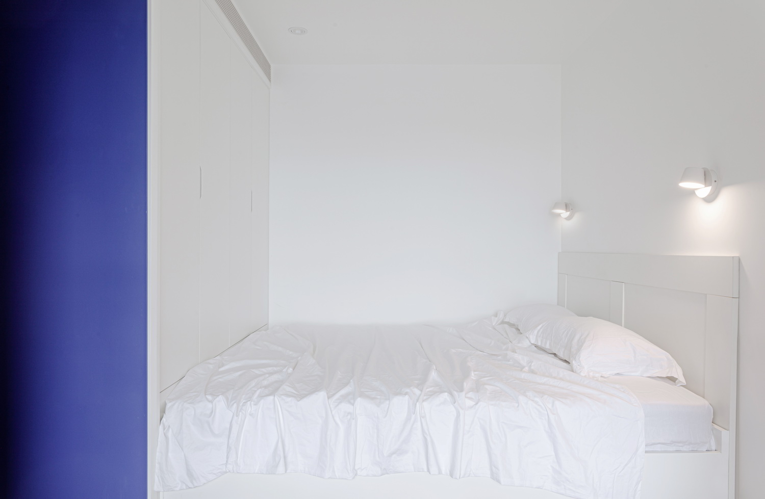 立面运用蓝白配色,简约明亮。设置大量储物空间,完美解决收纳需求,空间十分整体。业主可以在卧室休息、看书、工作……休息时,纯净的白色尽收眼底,床头两侧设置壁灯,创造出多重体验。