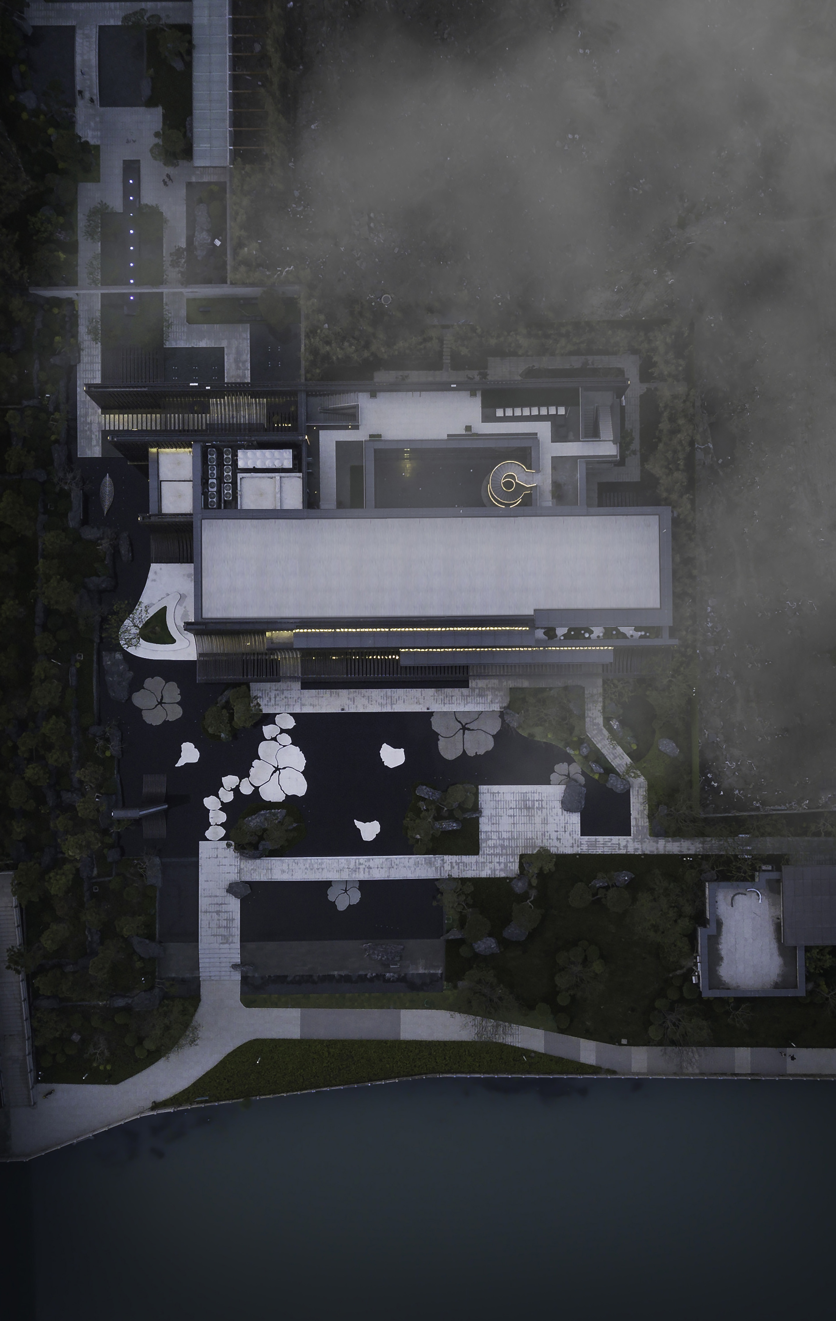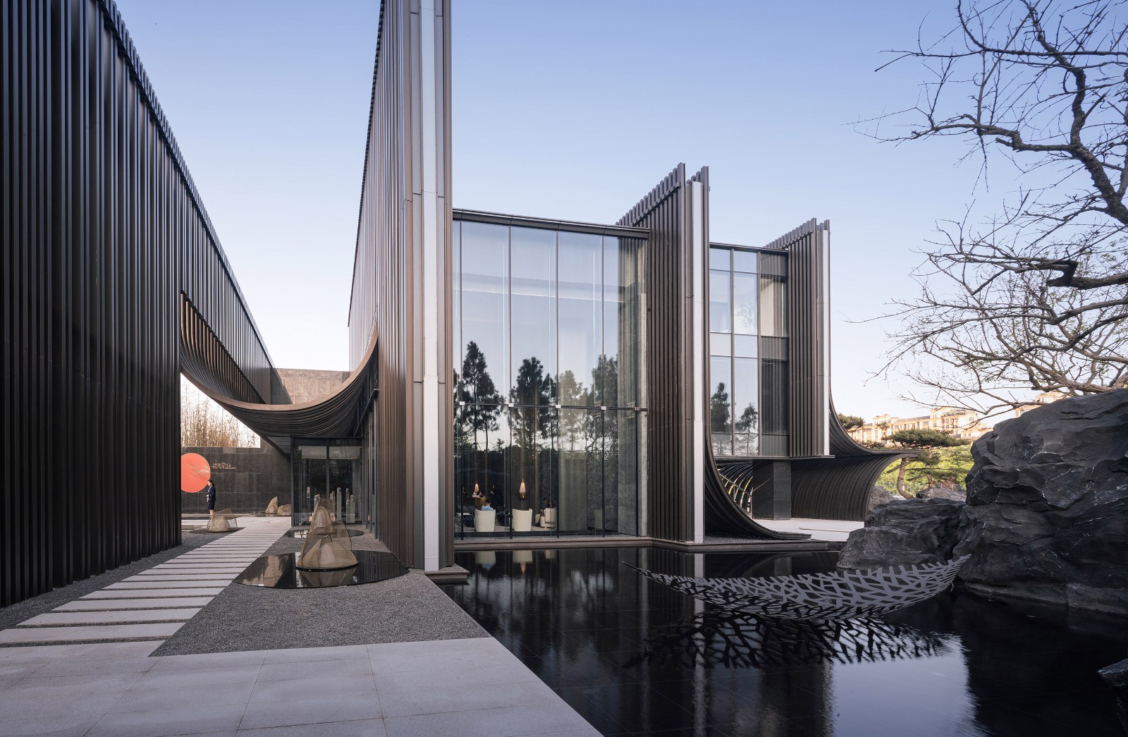 主立面由铝板格栅排列而成,通过重复的竖向线条,演绎出传统江南建筑的坡顶斜瓦。弧线元素在整体设计一以贯之,是构成整个建筑形象最重要特质的符号。建筑的灯光照明则尽可能地烘托建筑特色,形成强烈的韵律感。在夜幕降临,华灯初上,建筑仿佛又换了一幅模样,立于河畔。