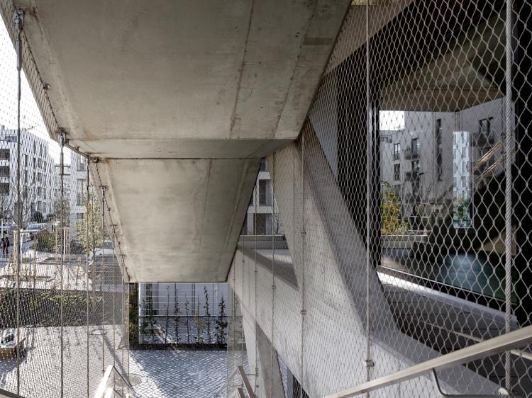 多层的混凝土同时也是立面设计的亮点之一。在层与层之间加进了实心的高性能保温材料。北部面向一条长廊,建筑从外部看更加闭合——只有底层的游乐场地可以通过玻璃幕墙对外部可见。阳台和拱廊都添加了不锈钢材质安全防护网。