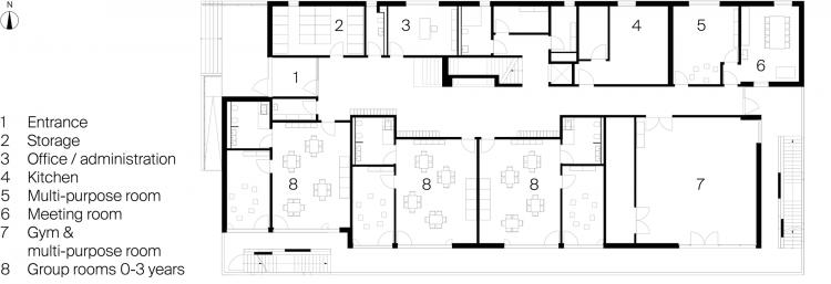 严格来讲,建筑包含了两个主要楼层以及一个屋顶区域。这样提供的空间可以给三组婴儿(0-3岁)、三组幼儿(3-6岁)和两组少儿(6-10岁)使用,总计可容纳142名儿童。换句话说,这个新建的幼儿园不仅可以满足当地社区的需求,还可以在更广的城市范围内提供服务。