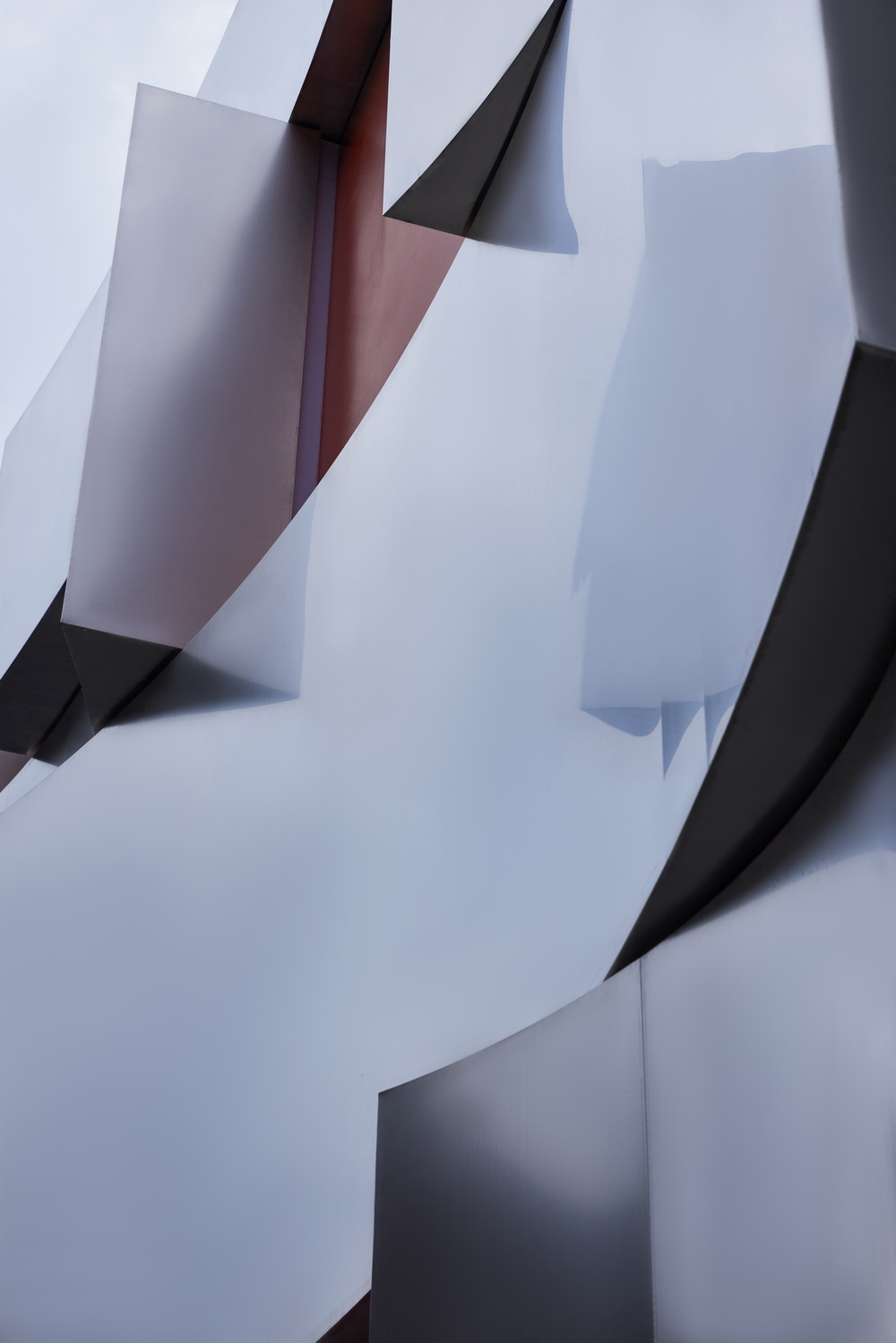 夜幕降临,铁色的幕墙下缓缓燃起橙火,门前不规则起伏的金属仿佛移动的地壳,将大地剖出亮眼的红色,途径的行人目击着一场静止的地貌变化。