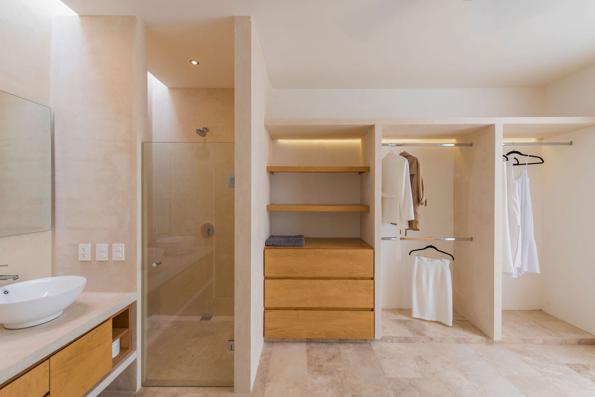 房子的设计关注房子的温暖度,清洁度和明亮度。房子的内墙和外墙和天花板都采用了一种橡胶质地的象牙色,在家具和门的选择上,选用了杉木和其他自然纤维的制品。房子内选用了亚光大理石地板,家具五金上选择了铝制品,高透的和磨砂的玻璃,哑光花岗岩和黄色玻璃,不锈钢的洗手盆和门把手。