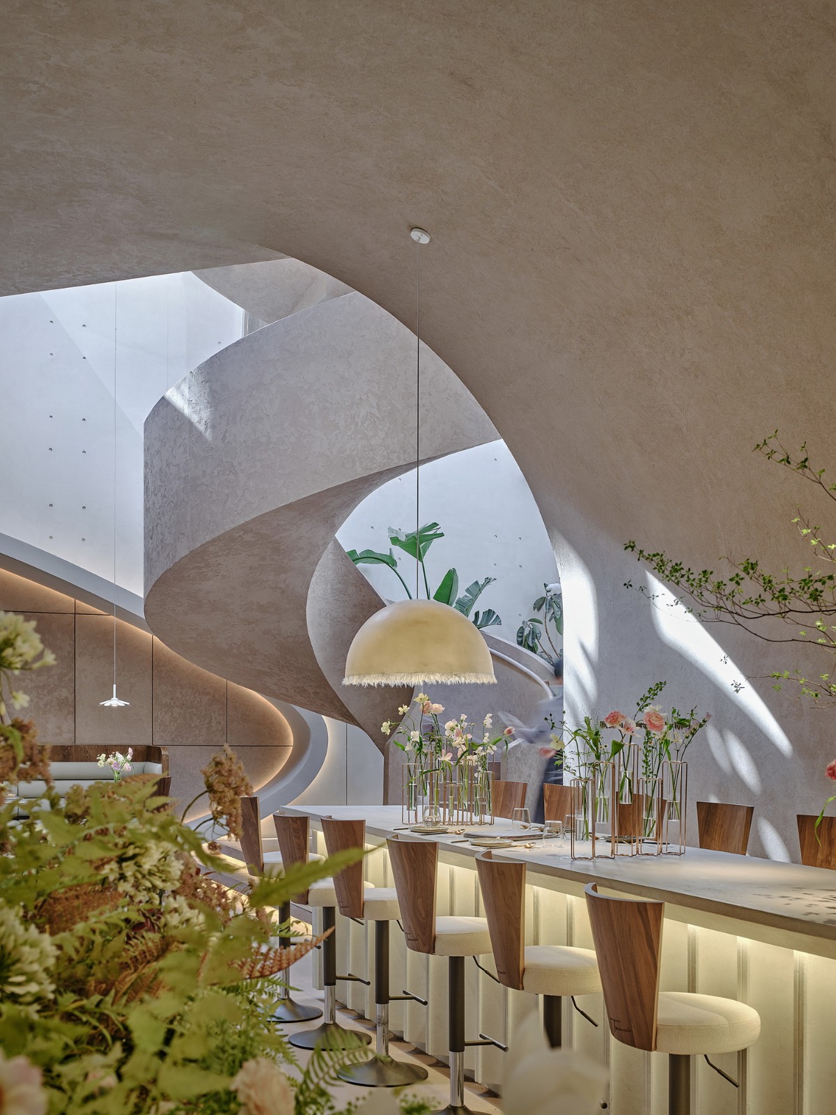 整个异化的构造形态为人与空间建立了联系,通过花瓣的形态建立了外立面的构造关系,通过石膏雕塑放大了花艺形态融入其中,通过物体和人的动线在空间中巧妙的引到空间深处,使空间具有浪漫氛围的同时,也能让客人在建筑空间内去感知自然变更所带来的光影乐趣。