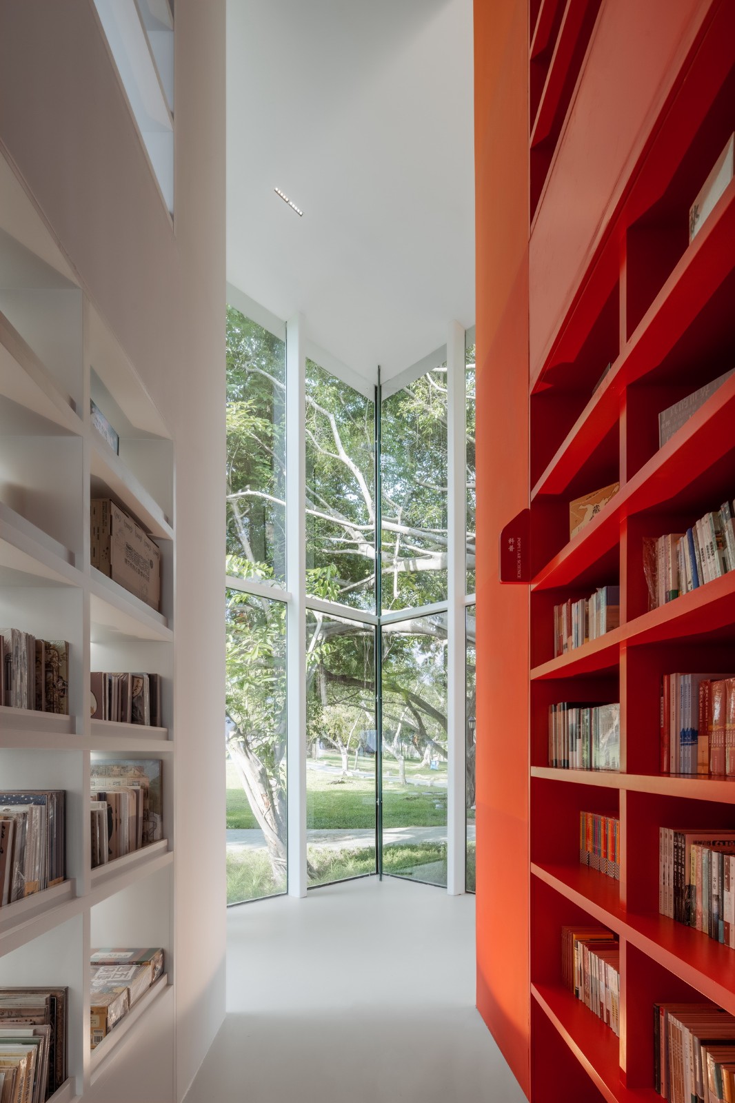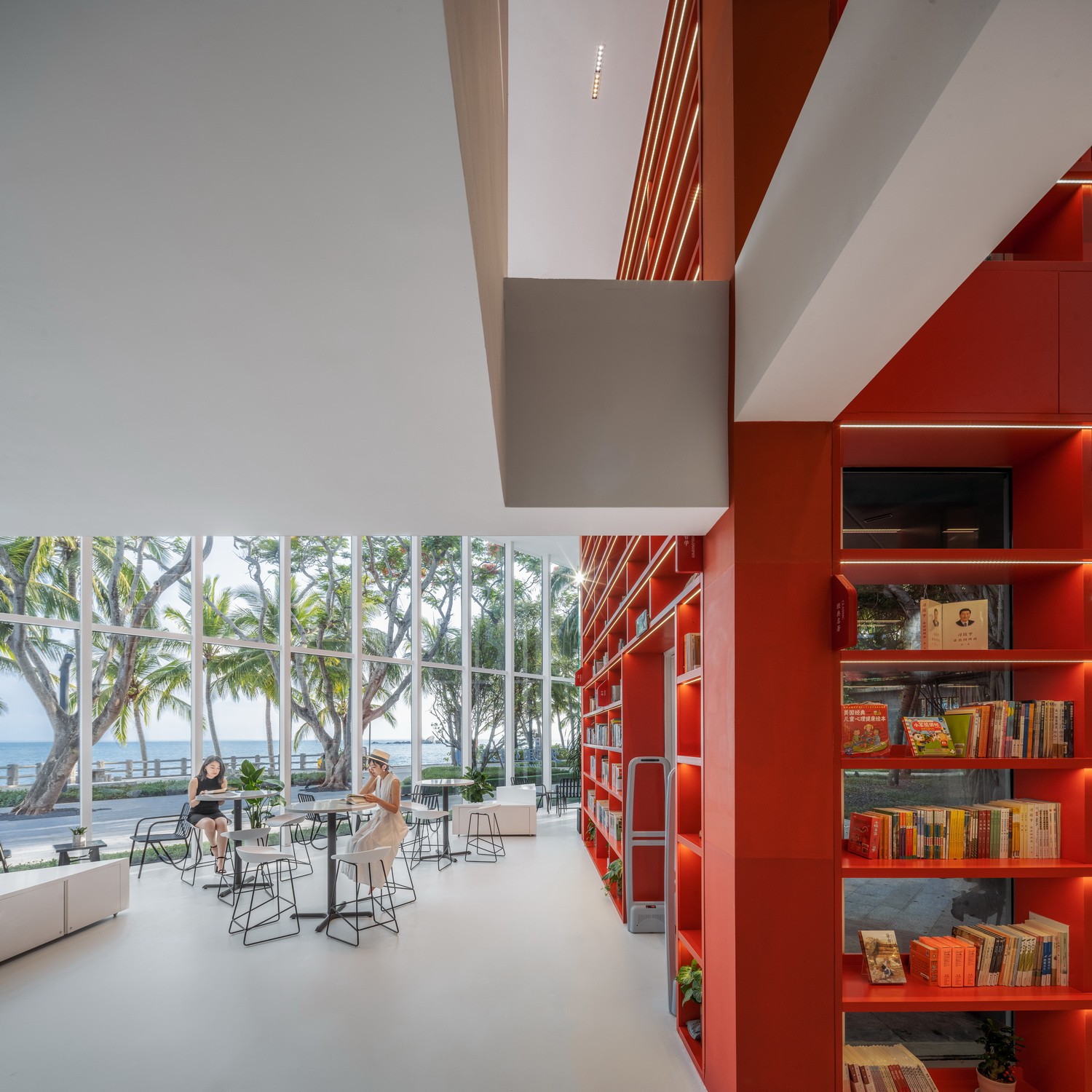 和冷静的玻璃立面形成反差。在中央三角区两侧对称的渐变的红色书架,象征着人内心熊熊的理想烈火。楼梯间藏在烈火里面,你拾阶而上,日光从三角形天窗洒落在你头上,默默注视着你不断高涨的欲望和雄心。这是Big blue前的一曲冰与火之歌。最初的设计最后变成一个实践的预言,即天涯书局这个400多平米的玻璃盒子,在疫情设计,在疫情严控中建造,我们都知道理解其中的难,也明白了克服困难的乐观的意义。它隐藏在沙滩边的树林里,谦虚冷静但强大地面对着大海。它是一个人类小小的文化宣言:不要温顺驯服地走进那广阔的蓝色,白昼将尽,内心咆哮燃烧。