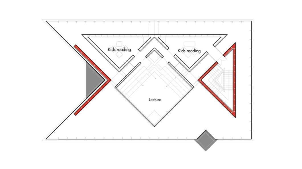 书局的功能是咖啡,演讲和书店。书店分普通阅览区和儿童阅览区。这些功能需要分层布置。建筑师把儿童阅览区和演讲区放在二楼,也弥补了保留榕树而损失的面积。为了保证玻璃盒子在四周的连续性。这个局部二层要和立面完全脱开而形成一个屋中屋的空间类型。建筑师选择了三角形作为楼梯间和二楼平面形式,并呼应了为保留榕树形成的西侧三角形户外空间。三角形内部空间和方盒子形成了内部在体验上戏剧性的冲突和张力,但这也是建筑师给自己的实施制造了难度。