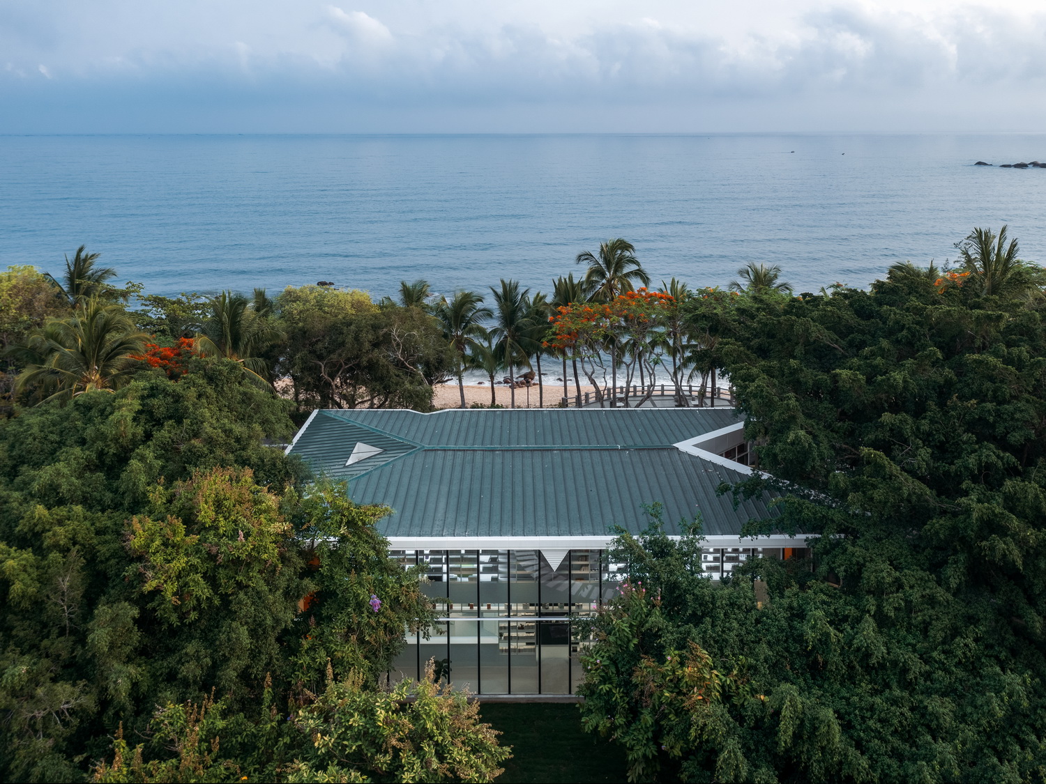 我站在三亚的大海前的那天,突然意识到面对变化莫测喜怒无常的广袤大海,人类许多自以为是的动作其实不过自娱自乐而毫无意义。但和夸张的动作相比,人的理想和思想以及感情又是配得上大海的。那个意识闪现的时刻,我内心如大海翻涌,但表面似乎很平静,我极力克制在自然面前不去表露肤浅的神色和动作。这促发我用设计去抓住那个时刻。我选了一道薄脆的玻璃作为书局面对大海的复杂态度。玻璃就是书局的物理界面和气候边界。我想在美丽景色中创造一个干净透明纯粹的书局。