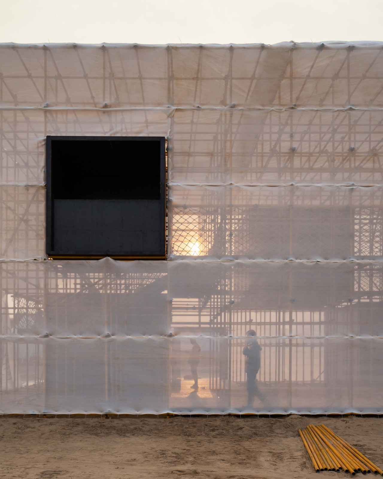 半透明的柔性材料将整个建筑外立面包裹起来。通过多轮比较反光、透光、质感等材料特性,设计最终选择了白色的网眼布。这种常用于衣服内胆的材料质地绵柔、有细密孔洞,其“模糊”的特质弱化了室内外的空间界限。在不同光线的作用下使建筑呈现多种表情,有时是白色体量,有时透露细密框架和人影。阳光、海风被网眼布过滤后渗透到室内,沙滩同样也延续到室内地面,视觉、听觉、触觉均可感受到自然元素在空间内弥漫。