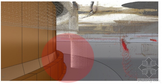 碰撞部位之一:现场土建立柱支模时出现偏差,多出中庭圆柱上下每层错位,且圆柱直径大小不一。铝板下口折边与立柱土建基层碰撞。