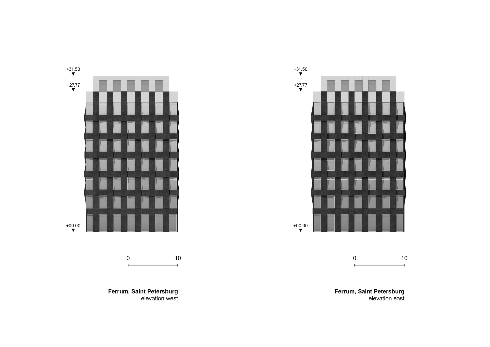 项目名称中的Ferrum一词意为金属,是对立面建造材料的一种阐述,也是对前工业遗迹历史阶段的呼应。雕塑般的立面以几何网格进行建造,呈现出一种连贯、动态且有机流动的松散织物感,暗含经纬关系。三维立体的条带更是在纵向和横向维度上贯穿矩形大楼,交替出现的扁平和突出模块更强化了立面的编织错觉感。