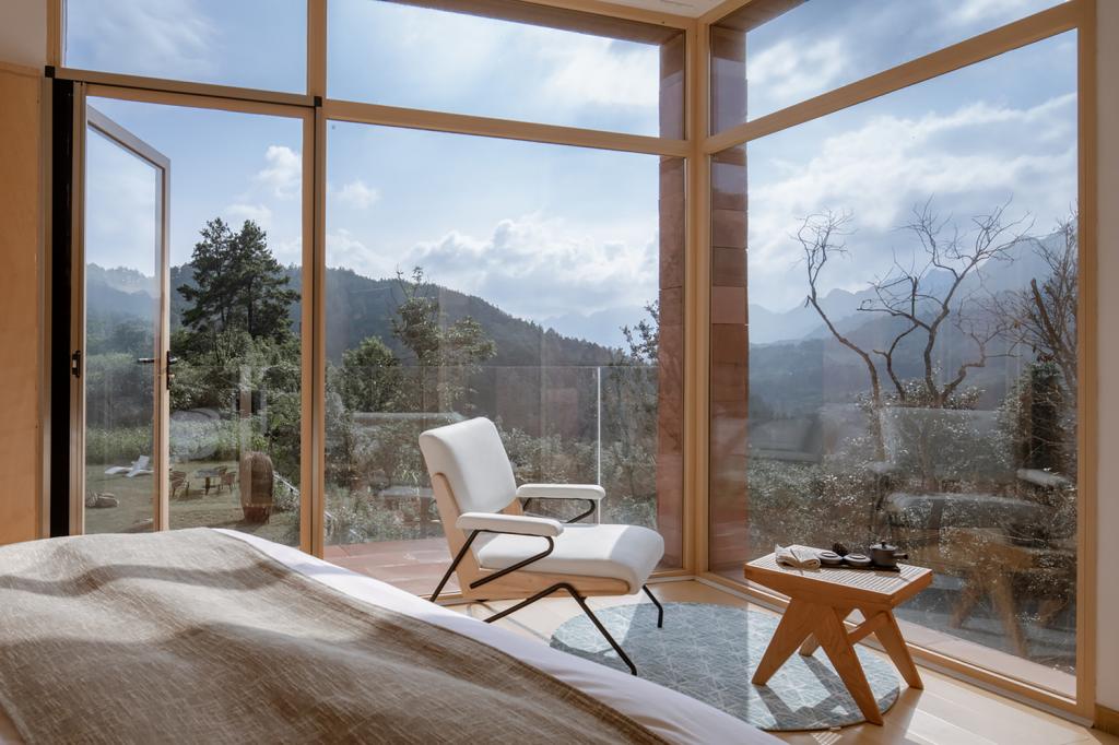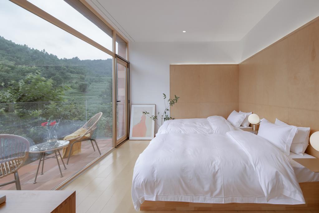 五个建筑单体作为主要的客房区域,呈现不同的空间状态,通透的落地窗形成景框,渗透别具一格的自然景观。承载独特的居住体验。螺旋通高楼梯作为轴承,将其中三个居住单元形成组团。通过纵向的路径序列串联起另外两个居住单元。整个居住空间形成一个多层次的有机整体,在空间流动上互为因果。