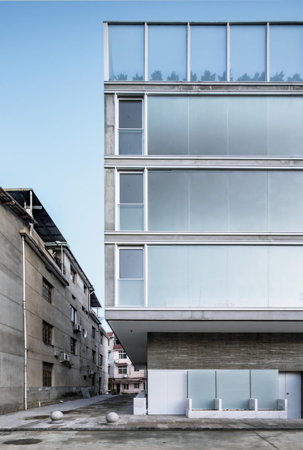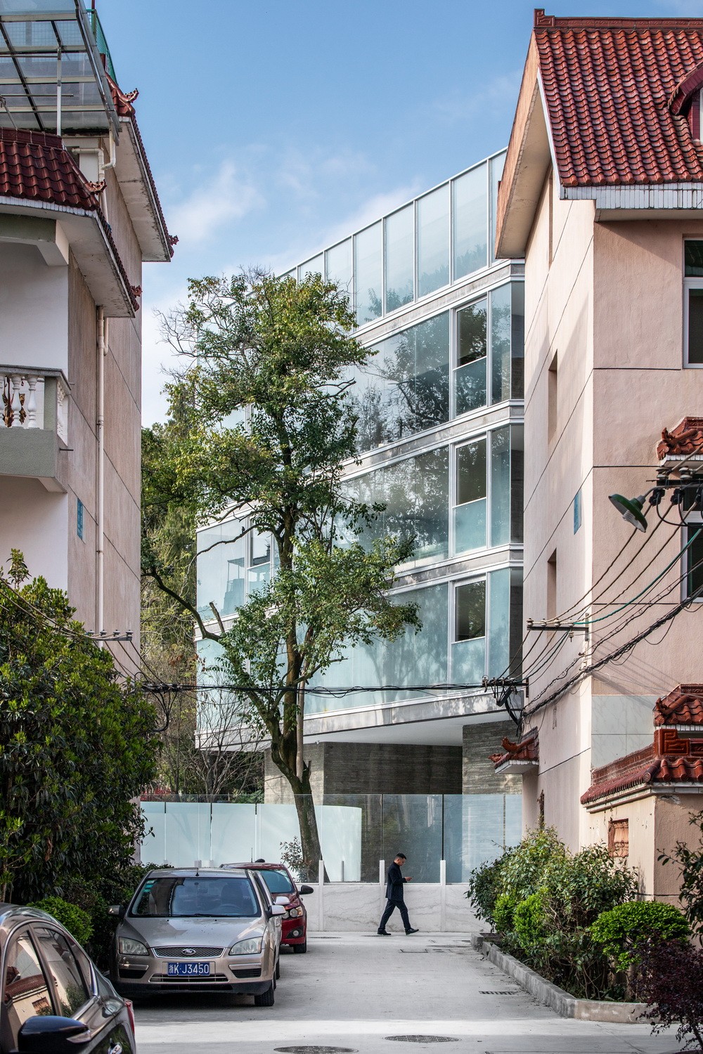 建筑立面玻璃延续追思园的透明渐变,在室内空间形成和城市街景微妙的过滤,也给日落时的树冠投影提供一层底色。