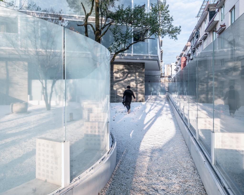 绕过透明曲线墙体后,到达路径的终点,树旁的古井和鹦鹉冢遗址;周围墙体通过多重透明度的叠加,完全遮蔽城市,围合出一个停留的追思空间。