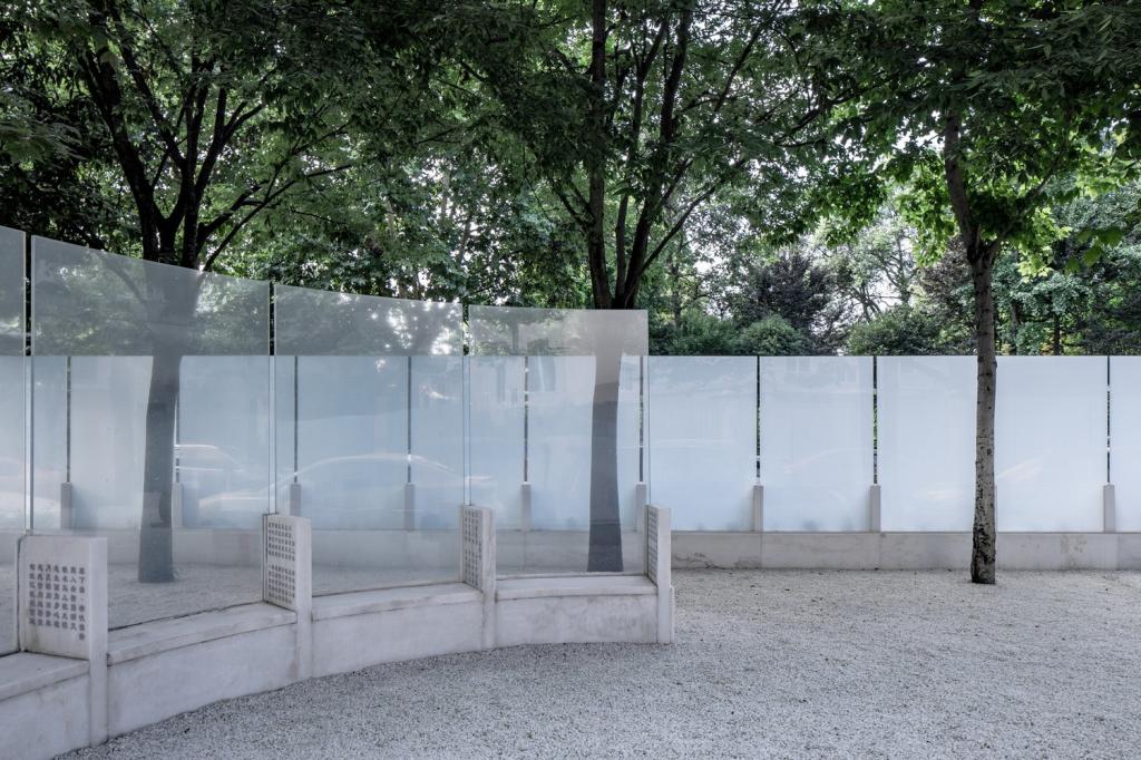 建设场地作为追思园,保留原有的遗址和树木。设计中最大的挑战是场地兼具城市道路的边角零碎和重要历史文化遗址的矛盾。应对的策略是通过围墙强调场地的边界和场域感,形成和城市道路隔离的独立场所。从北侧主入口开始,墙体延伸进追思园,沿着树木的位置连线,勾勒一条内旋的回路,将参观者逐渐带入到场地中心树荫下的遗址空间。延长的路径,以及路径的宽窄变化,调节参观者的行走和行为方式,酝酿从周边喧闹的城市环境到追思空间的转换。