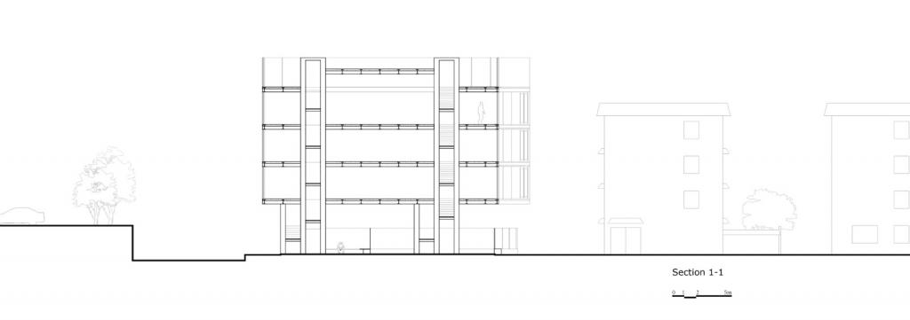 项目的另一个挑战则是,诗文馆建筑必须遵循场地原有民房的边界范围,体量较小,需要容纳展览和研讨办公等功能,并且满足公共文化建筑的消防疏散等规范要求。依照场地原有的建设边界,把诗文馆从地面提升,既扩大追思园的面积,也和地面园林互为对景,分别构成竖向和水平向的空间延展。唯一落地的两个疏散楼梯,兼做结构核心筒,在每层平面划分不同空间层次。东向墙面尊重隔壁邻居要求设计为实墙,可以作为室外绿化爬藤墙面,也是室内空间的展示墙面。其他三面则通过玻璃墙自然采光并向城市开放。