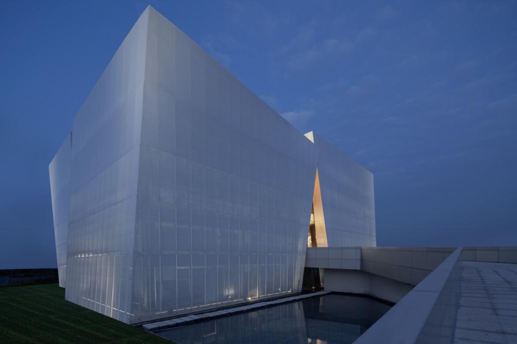 在白色冲孔板的覆盖下建筑若隐若现,夜晚灯光打亮整个建筑,透过冲孔板散发着光,像是旷野中矗立的玉石。景观设计与济南“泉城”的盛名相呼应,沿着主干道的展示面使用了跌水设计,从4米高的石阶上层跌而下,并设置了一座连桥。外侧是涌动的跌水,内侧是宁静的水面,动静相宜。