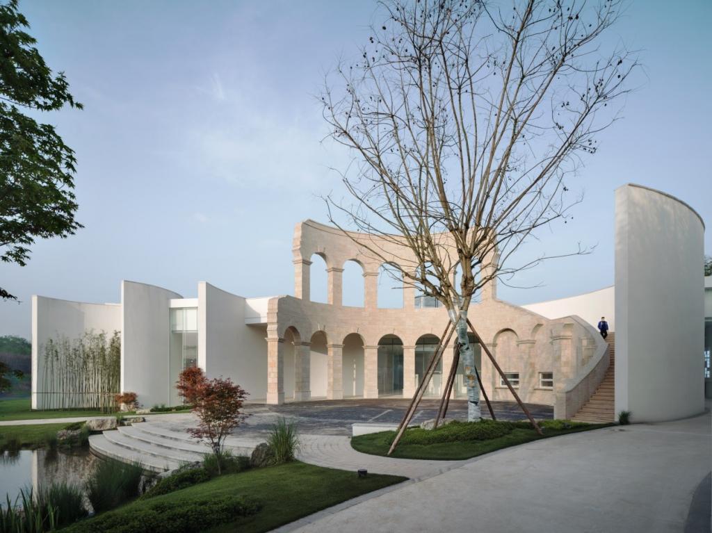 以展馆为核心串联起周围生态林盘。圆形空间分为室内和广场两种形态。入口的喷泉广场由3个室外半圆形围合而成,意大利广场则由罗马拱圈废墟环绕而成,广场与室外剧场分别再现典型的意大利城市广场形式。穿过檐廊到达意大利广场,沿弧形楼梯拾级而上,到达屋顶两处圆形花园,通过自然植被与石材的对比,两处花园一东一西,相得益彰。从屋顶往下经由文化长廊,或踏过水塘之上的汉白玉步汀,到达东侧的中华文化馆。两条路径寓意介于东西方之间,陆地和水上的丝绸之路。