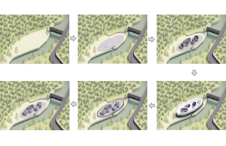 向着半透明的白色装置继续前行,沿着最后的水路一直走,便可以发现通往方舟的阶梯。方舟主要功能是厕所和浴室,以及供游客休息的一处平台,底层内部功能组件,形成一座小迷宫,如遗迹一般。由于方舟位于景区深处,到达交通困难,在材料选择上,底层突出一种原始和蛮荒。院里螺旋上升的阶梯,联通到二层平台,与底层材料不同,钢结构组成的构架,支撑起白色半透明织物,如同蚕茧。茧作为一种状态,被我记录下来,保护着自己,也为小十二秘境提供一个安全场所。在茧的包围之中,穿过交错的“蚕丝”登上屋顶,仰视群山,内心平静。
