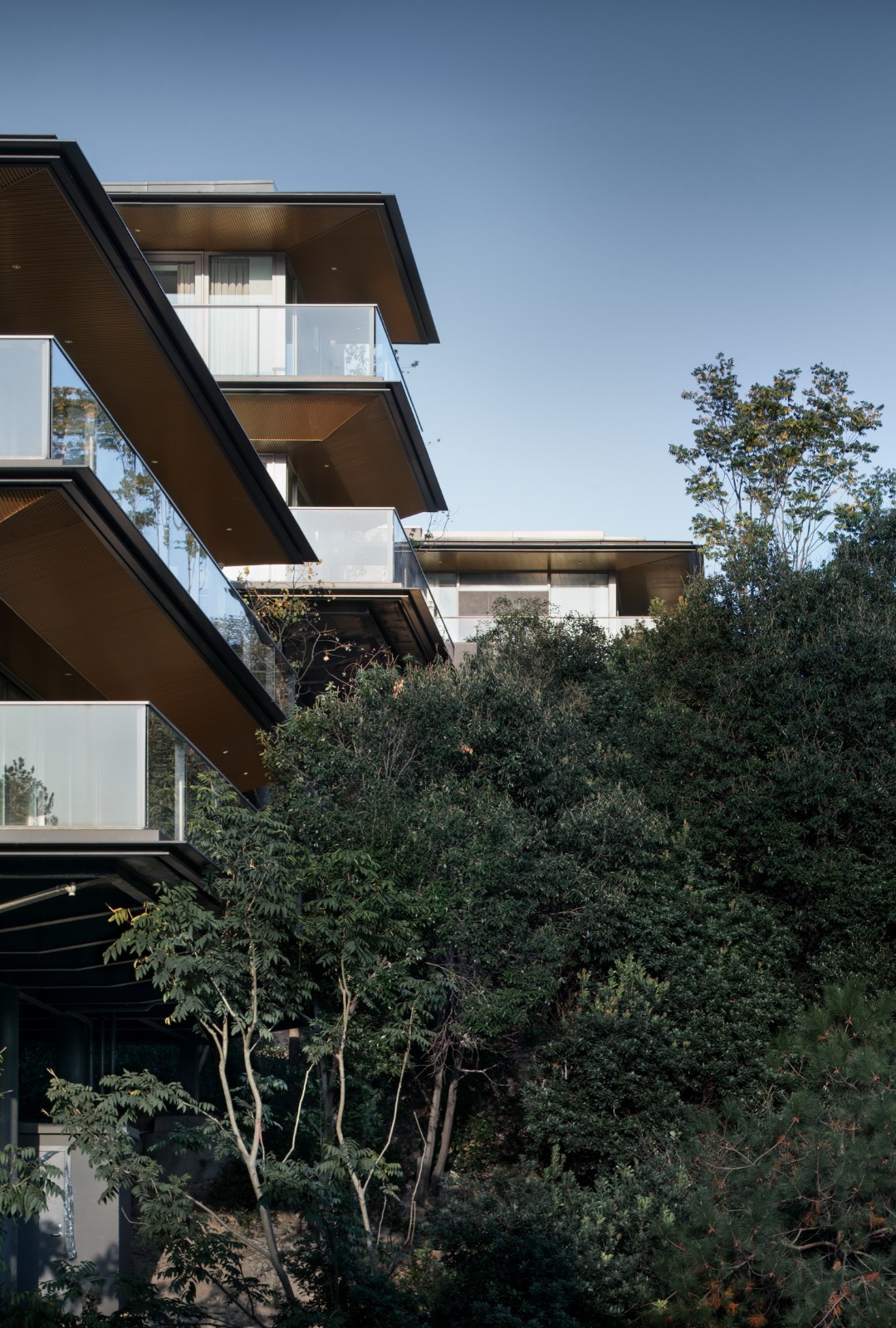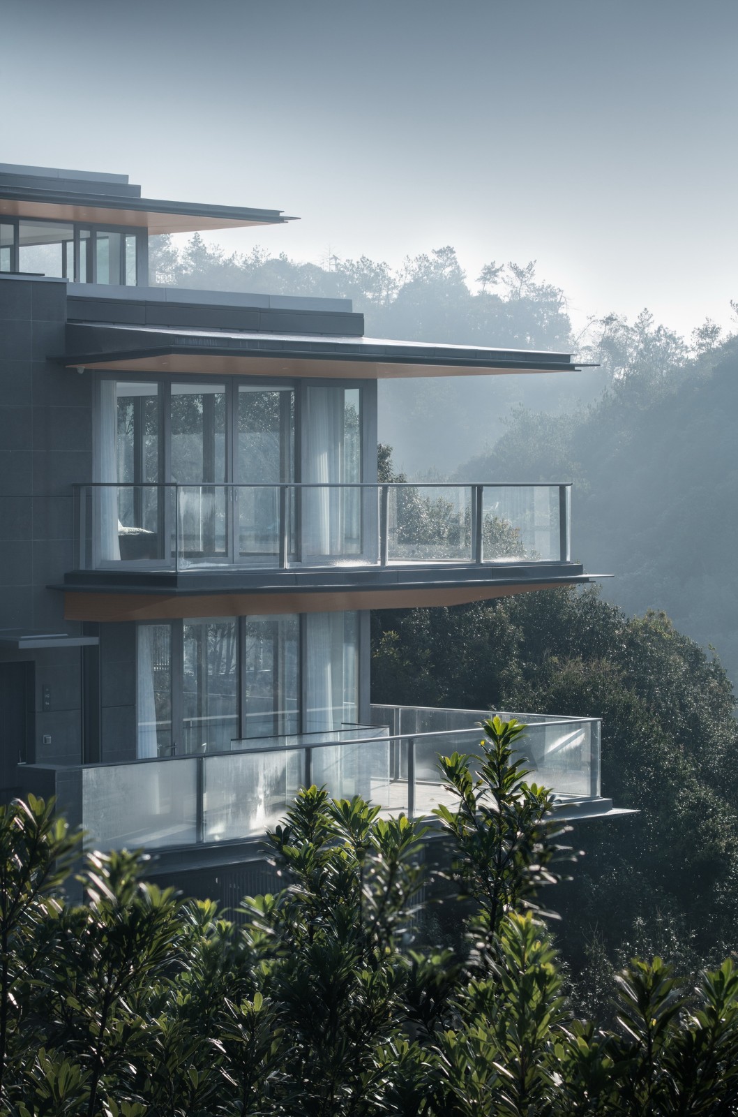 项目以尊重自然为先,选择对环境压迫感最小的钢结构作为主体结构,同时维护结构选用了耐候性好且维护率低的石材和合金材料,最后以深色铝合金线条勾勒出建筑静美的轮廓。立面设计中,大量采用外设深远飘板,仅点缀少量纯净玻璃体块,飘板在原本简洁硬朗的建筑体量与山林中形成了一道柔软的过度,削弱了其对环境的压迫,而玻璃盒子标示出组团的位置特征和空间记忆。谨慎选用的深灰色火烧面石灰石、配以深色铝合金板材和木质格栅吊顶,让建筑与山林形成了素雅和谐的总体色调。