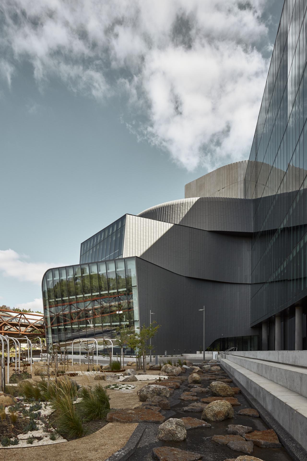 建筑中有两层空间完全致力于学生支持、健康及心理健康服务,也设有服务于整个校园的静修和沉思空间。此外,康乐花园坐落在法学院大楼和加德纳斯溪保护区(Gardiners Creek Reserve)之间,并以当地植被、石块、解构主义溪流和层层叠起的座椅为亮点。而位于五层的冬季花园则为人们提供了一个高于树木的空间,并在其中设有垂直绿化墙和落地玻璃百叶窗。此外,大楼还囊括了三个充满实验性的大体积“前沿学习空间”,并以此挑战传统的学习空间型式:宽敞的的阶梯式讲演空间兼备了演讲和协作的功能,大型的团队工作空间则可以根据时间安排同时作为正式和非正式学习空间使用。