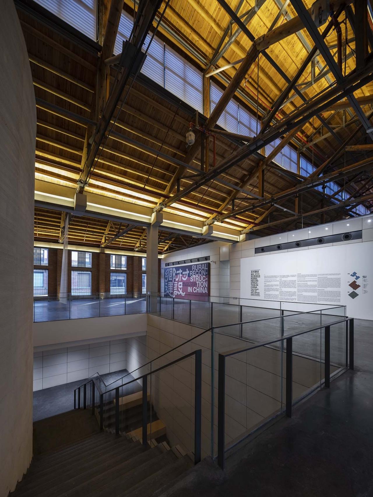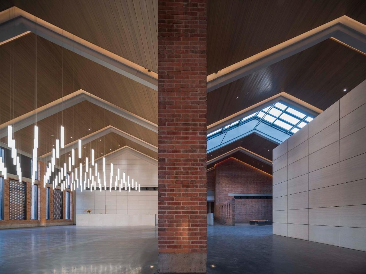 从入口广场拾阶而上进入新的门厅空间,门厅空间采用“人字“型混凝土屋顶,其原型来源于老厂房屋架空间,但以更加现代简洁的手法诠释艺术空间魅力,门厅内灯具设计为陶状,与当地文化呼应,同时强化门厅空间艺术性。设计来源于原型,但必须超越原型,只有这样历史与现实,个人与社会,特殊性与普遍性才可以通过设计过程实现完美融合。