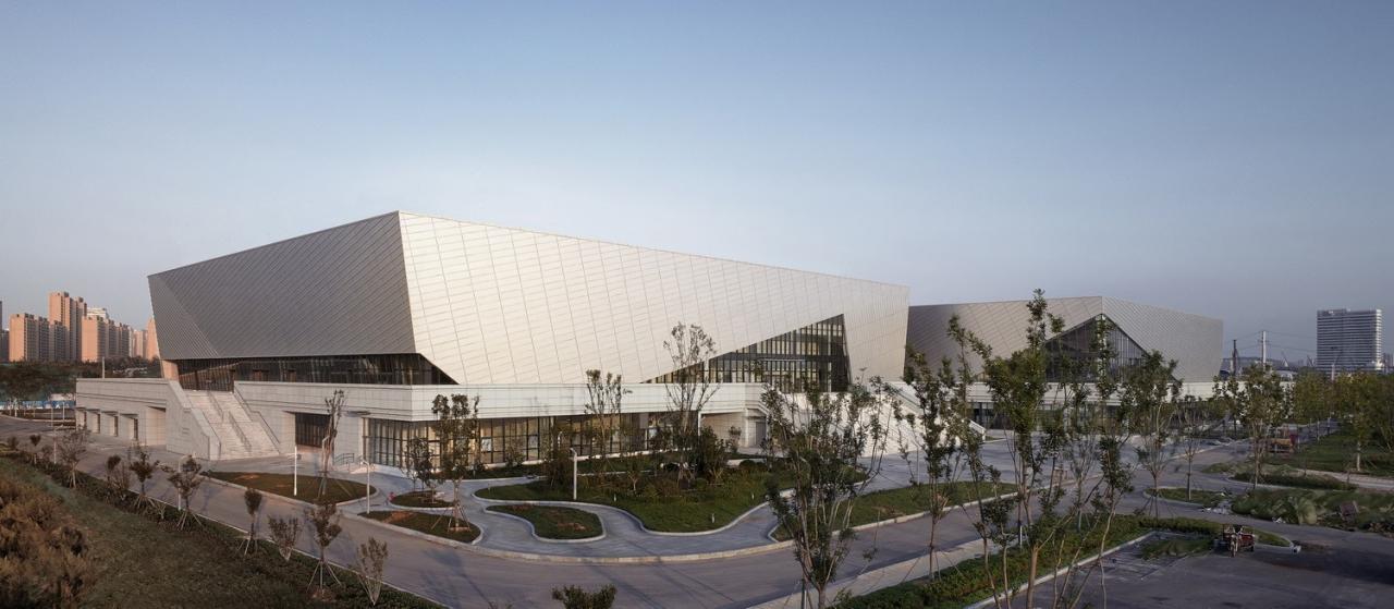 建筑希望在简洁的形体中凸显未来感与科技感。建筑的表皮选用富有光泽的银灰色铝板作为主要建筑材料,简洁而富有科技感,符合山东齐鲁大地豪迈大气的地域风格。铝板的拼接经过精心设计形成斜向上的硬朗线条造型,表达体育建筑的力量与速度。入口处三角形幕墙的使用引导游客及使用者顺利找到建筑入口进入大厅,场馆两侧的三角形幕墙塑造室内光线渗透与通透性,在雕塑建筑的同时充分发挥实用性。