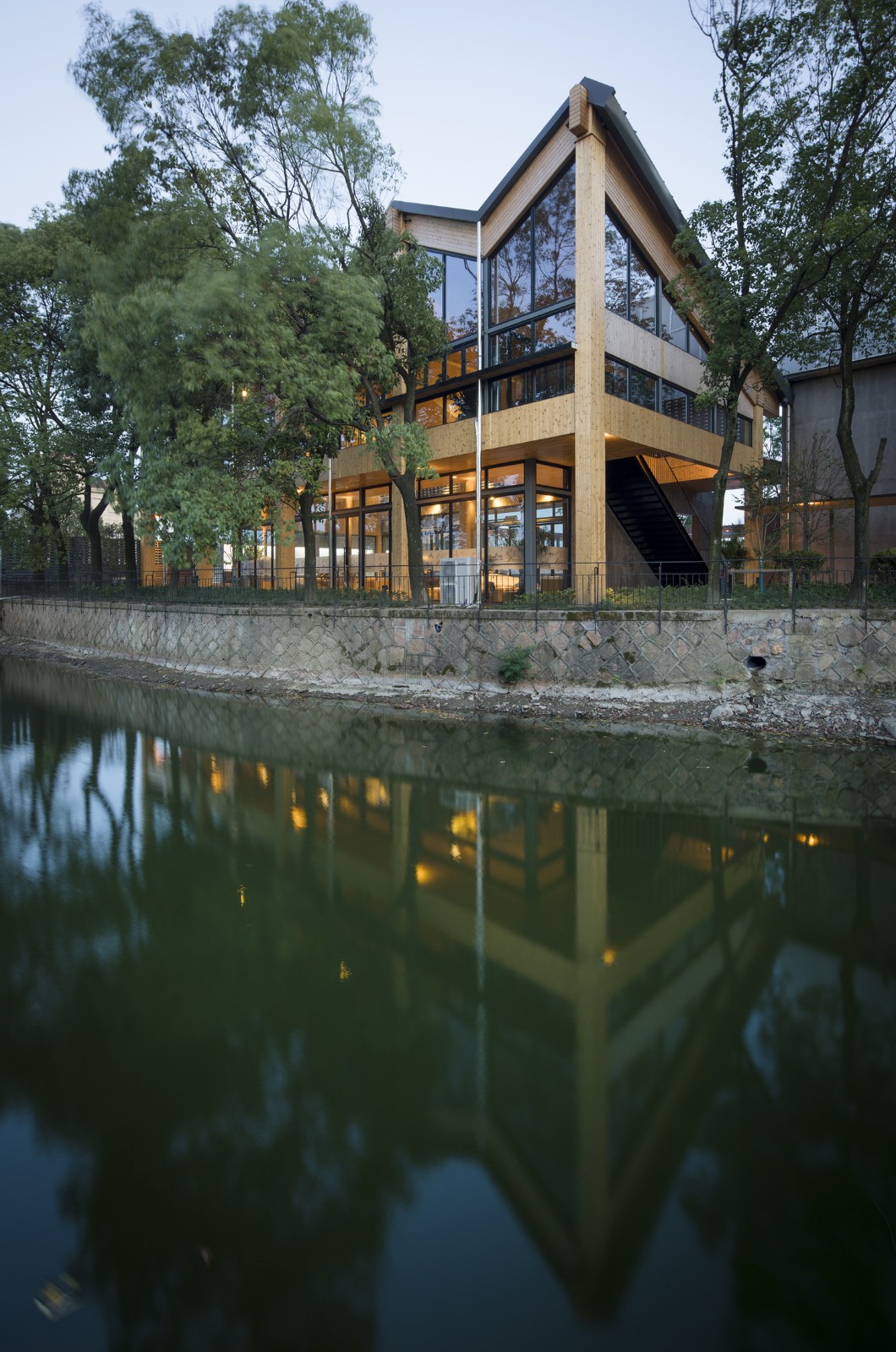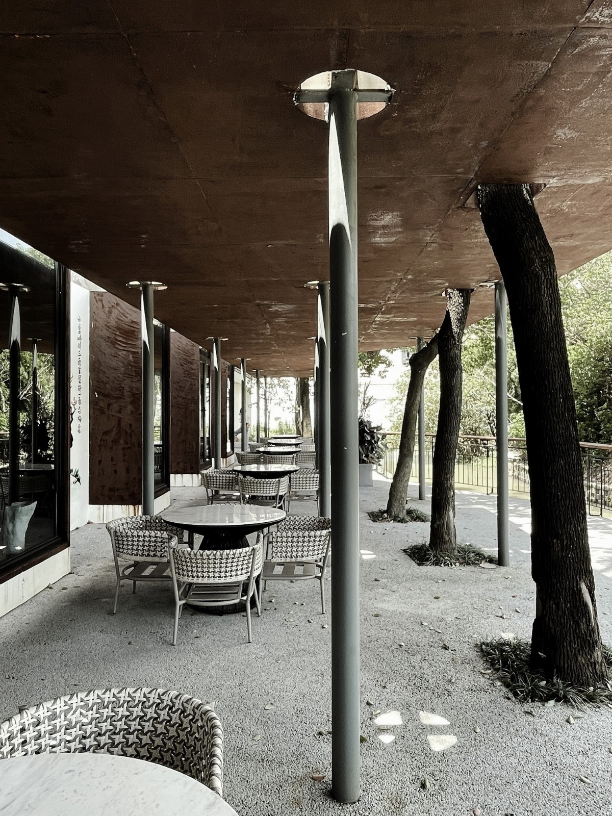 保留旧的叠加新的,我们希望走入场所的人仍然可以感受到这个建筑的曾经与记忆。90年代盛行的绿色油漆、蓝色马赛克甚至原本车间的铁轨都具备很强的特定时代记忆感。在进行修补与新建的时候我们也同步将这些元素进行了留存。为了更好融合场地与环境,保留原场地临河的香樟树外,在新建回廊及窗框材质的选择上使用了大量的具有斑驳感的耐候钢材质。