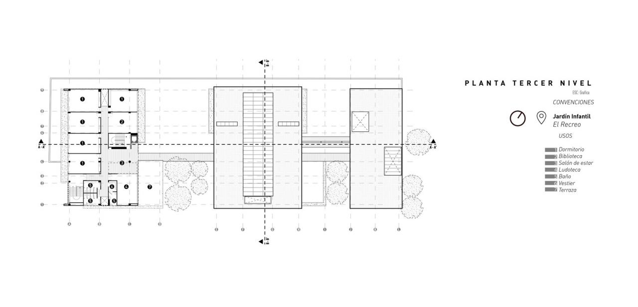 公共空间与基本的教室、厨房、餐厅等被布置在首层,向庭院和公共空间开放的位置。这样一来,这些区域便可以用于各种课外活动,从而支持和加强中心与社区之间的关系。托儿所与学步车能穿过的地方同样位于该层,因为使用者的年龄更小,因此也是优先疏散的区域。