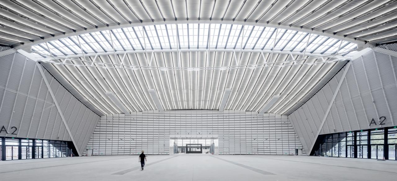 展馆自南向北划分为四个展厅以应对互联网大会和未来多元运营的功能要求,分合之间,既可以在大型展会时串联使用,又可以并联单独开启从而应对未来不同规模和性质的活动。每个展厅通过采用中高外低的空间断面,充分考虑独立展厅空间的感受和适用性。设计师将主张弦梁布置于展厅中部,利用张弦梁进行起拱,实现空间需求。同时将张弦梁在顶部打开,引入天光,进一步结合结构提升空间品质。