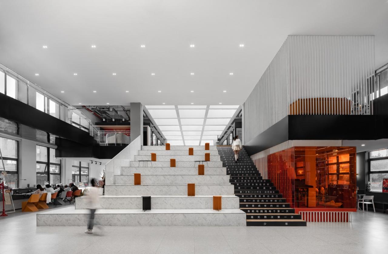 设计保持了原建筑的顶部结构,阳光通过中庭挑空洒在后方的社交广场处,学生们喜欢三两聚集在这里聊天。