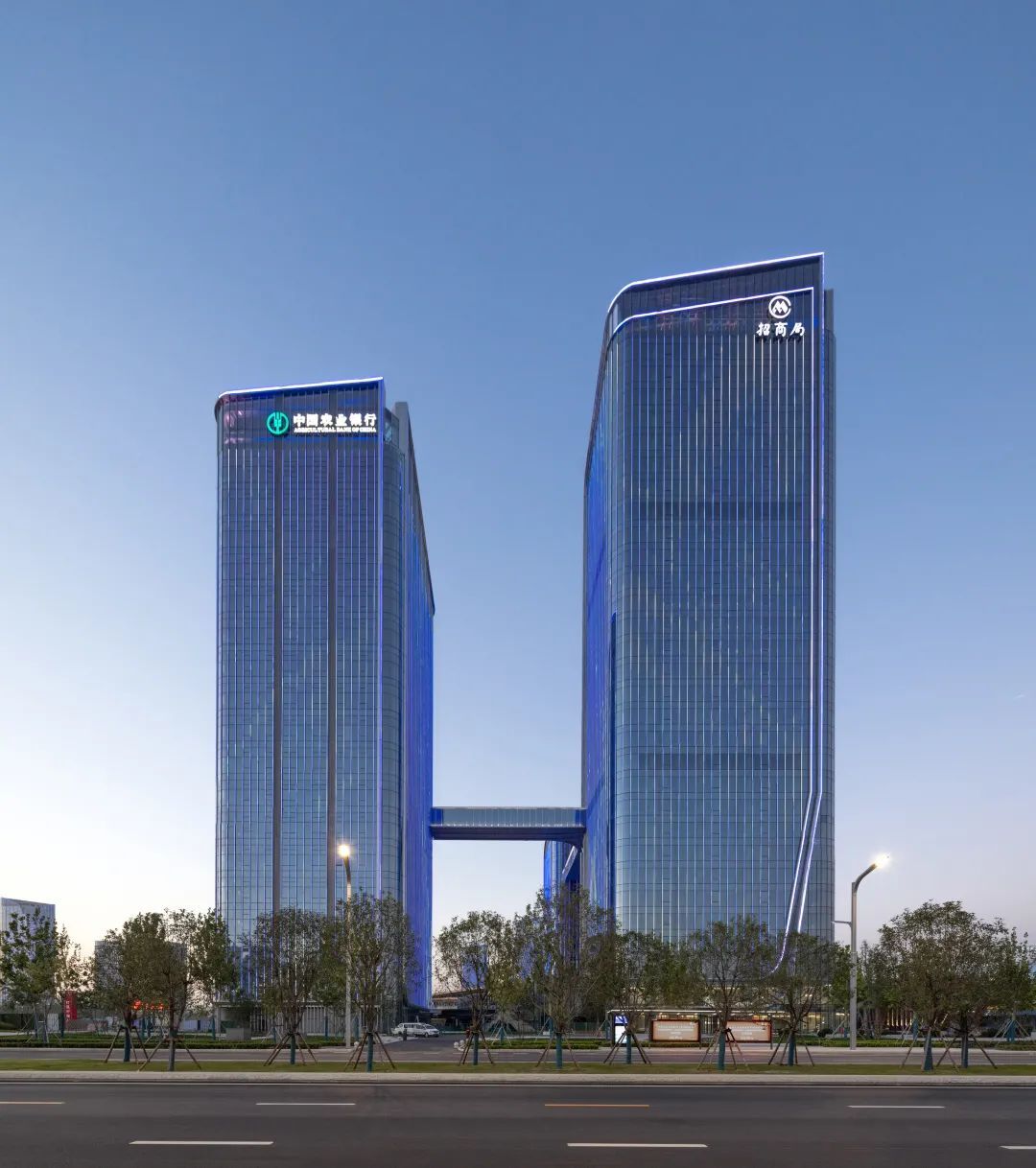 由三益主持设计的招商蛇口西安丝路中心项目,是本次第十四届全运会重点配套项目之一。项目由南北两个地块组成,分别位于奥体中轴公园”长安谷”主轴的南北两翼,建筑沿中轴对称布局,作为”奥体之翼、中轴之门”,与奥体中轴生态公园相辅相成,隔景观带对称分布的两座三体式建筑群落形成环抱奥体的空间形态,既体现了开门迎客的寓意,又塑造了西安城市门户形象的效果。