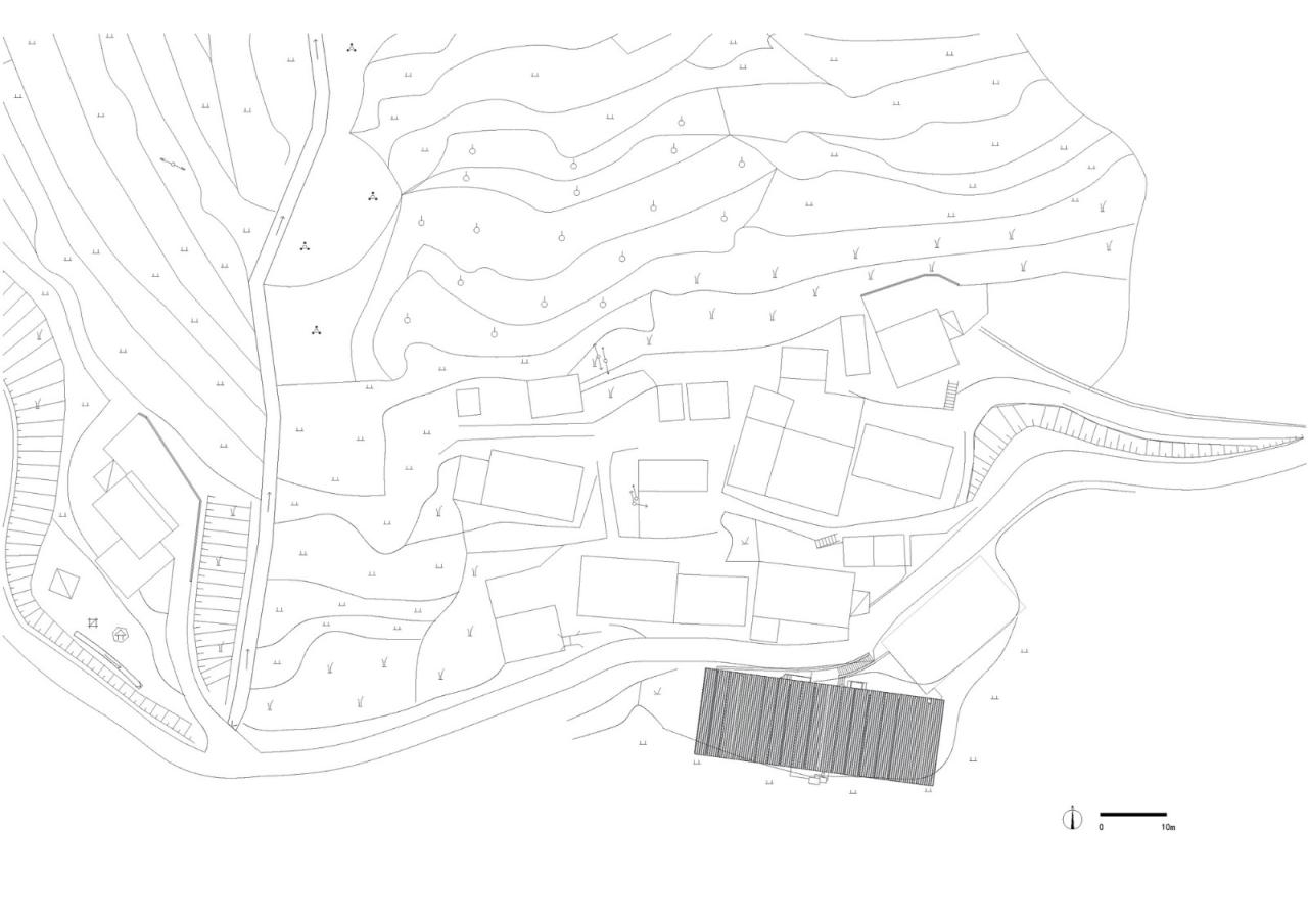 雨,是因重力落下的水。水,既无形又有形,既柔软又强力。容器可以刻画水的形状,重力可以推动水的力量。水的顺导是对重力动态的刻画,容器般的建筑则是对重力静态的塑造。一静一动,被牛顿精简成公式的万有引力,因建筑能够呈现出多种推演的证明。雨屋位于远离城市的半山之中,周围被竹林和农田环绕。两座分开的村宅用一片大屋顶覆盖。屋顶被圆柱撑起,雨水得以多种方式和路径导向地面,形成一种无形和有形的对仗。于此,我们称之为顺水六式: