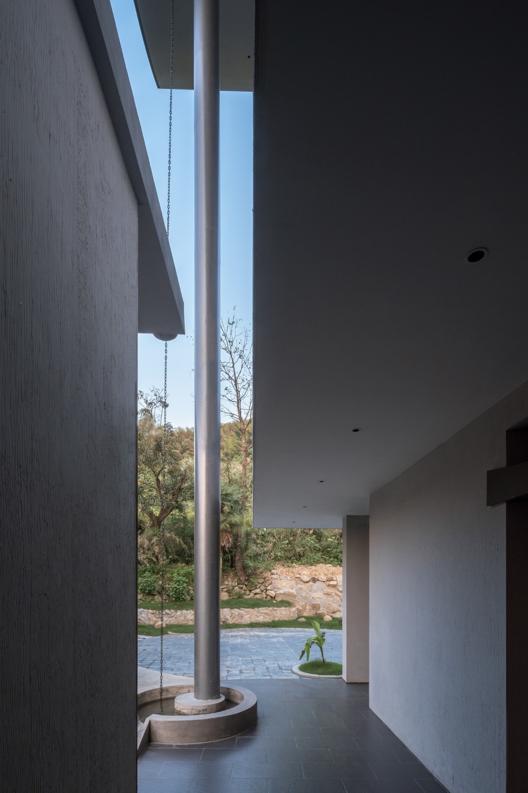 2、川水水路沿竖直方向奔涌而下,形成最有力量的疏导。“水滴石穿”是描述水力的古老形象。而在设计中则是让水路向下洞穿混凝土板,让水之力得以显形。