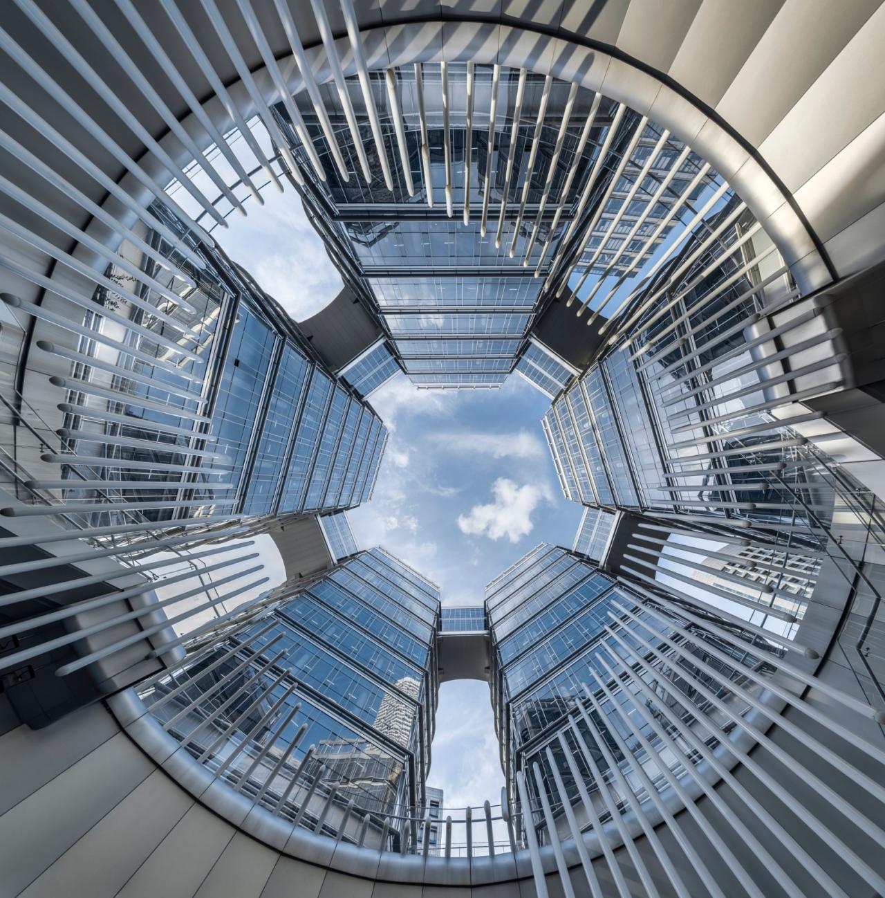 形体以“中通外直,不蔓不枝,香远益清,亭亭静植”为立意,采用5个花瓣向上层层绽放的形态,横向的浅香槟色铝板既满足遮阳要求,又形成立面上统一的基调,追逐着阳光,洒下不同时段的阴影,增强建筑的体量感;沿着曲线无限延伸的玻璃幕墙和小尺度的办公进深相得益彰,最大程度地将自然光引入室内深处,为员工提供一个自然舒缓放松的办公空间。 竖向的金属圆管,轻盈的穿插在横向铝板之间,在阳光的照射下,宛如清晨点缀在花瓣上莹润的露珠,灼灼其华,温婉动人。
