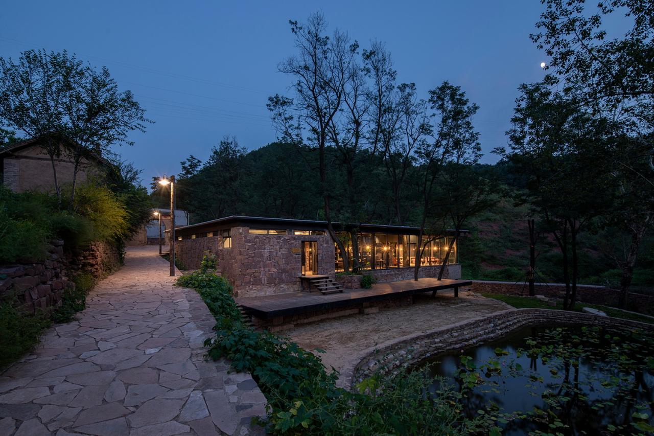 项目始于场地的选取。正如设计团队大部分项目一样,场地并不是指定的,而是在踏勘过程中,精心挑选的结果。韩洪沟老村呈一个狭长的梭子形,场地位于韩洪沟老村中后部,前面是村中的沟渠和空地。因为正好处于地理长轴的中线上,所以场地很自然的成为了视线的焦点,也是观赏村庄中心景观最理想的位置。选择在这里设立休闲性的公共建筑,其逻辑类似于中国传统园林中亭或轩榭的设立,既是观景的落脚点,也是被看的景观主体。