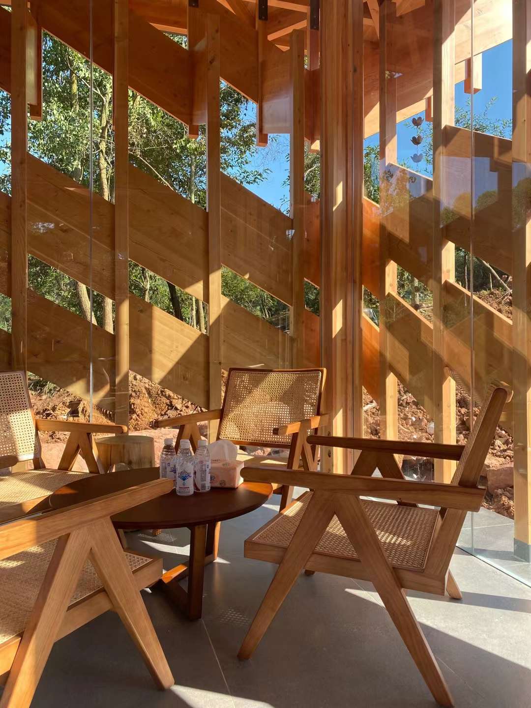 观鸟屋采用与自然更加亲近的木材作为主材,四周通透玻璃开阔视野,鸟儿从湖上掠过,湖光山色尽收眼底;建筑外立面装饰面造型由现场的山、石、叶、树演变而成,通过有序的排列组成独特的节奏与韵律;