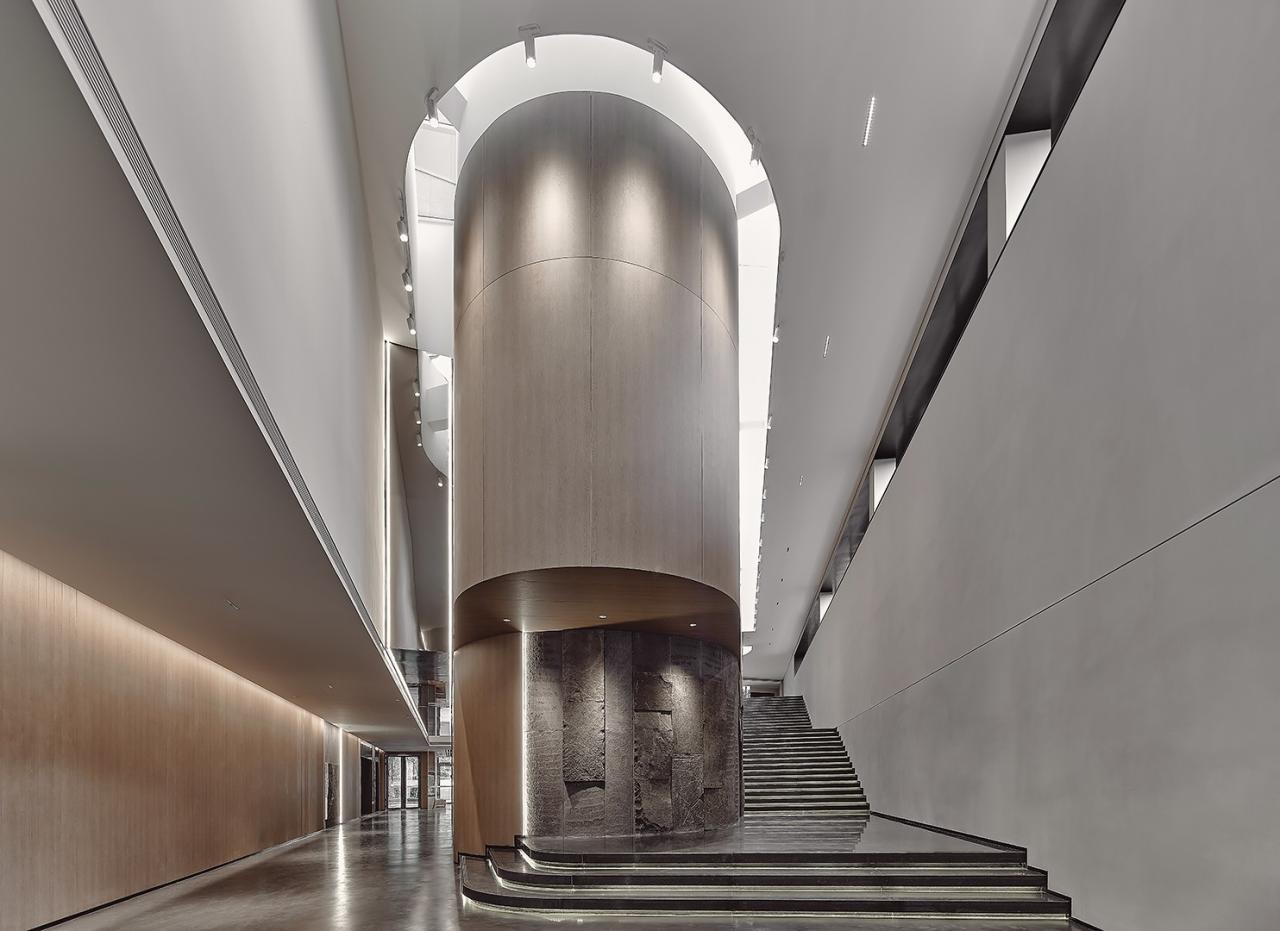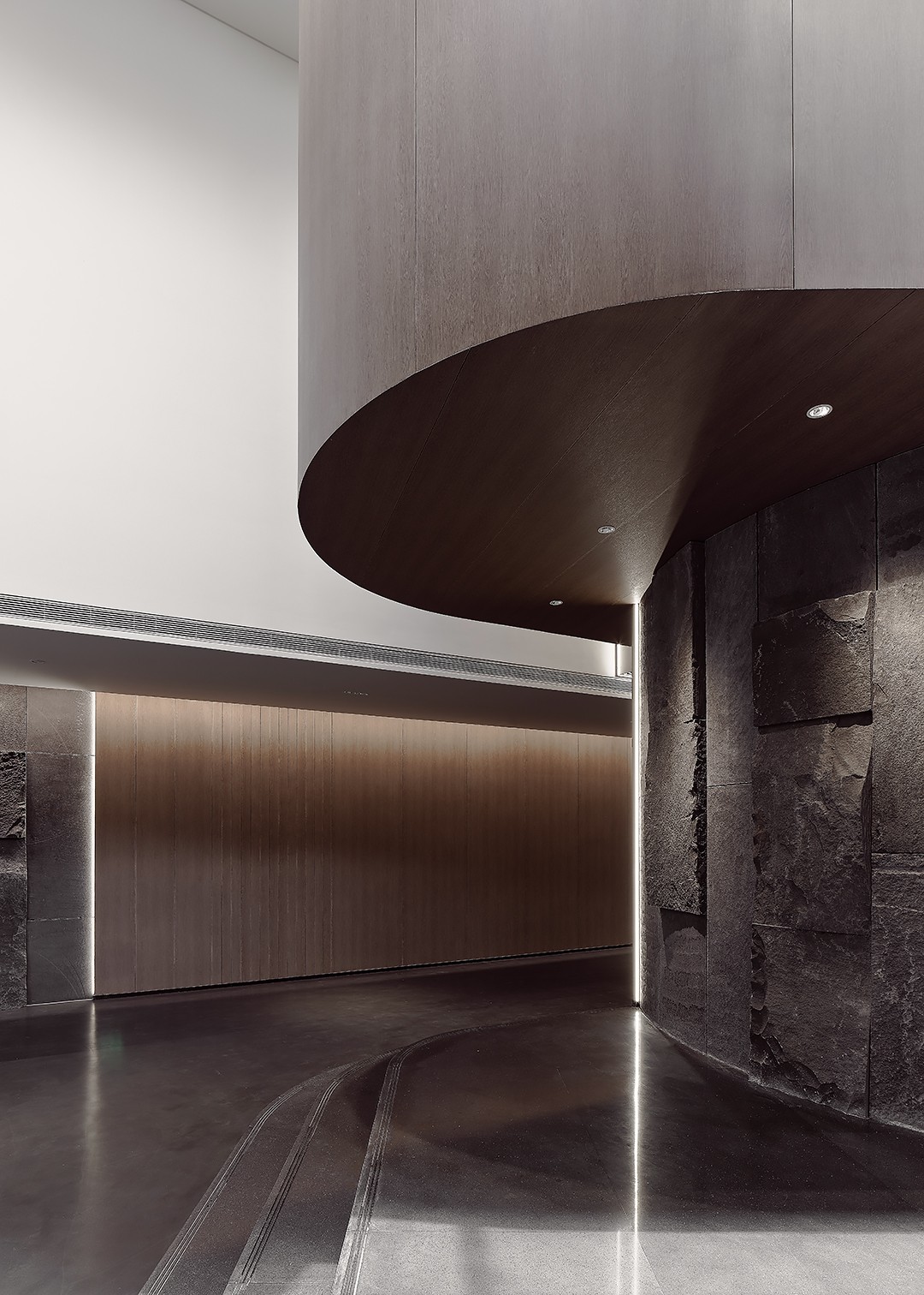 粗粝的片墙笔直楔入室内,使入口形成了从外部延伸入内的自然过渡,同时内部前台也采用了与片墙相同的石材,更凸显出设计的整体连贯性。