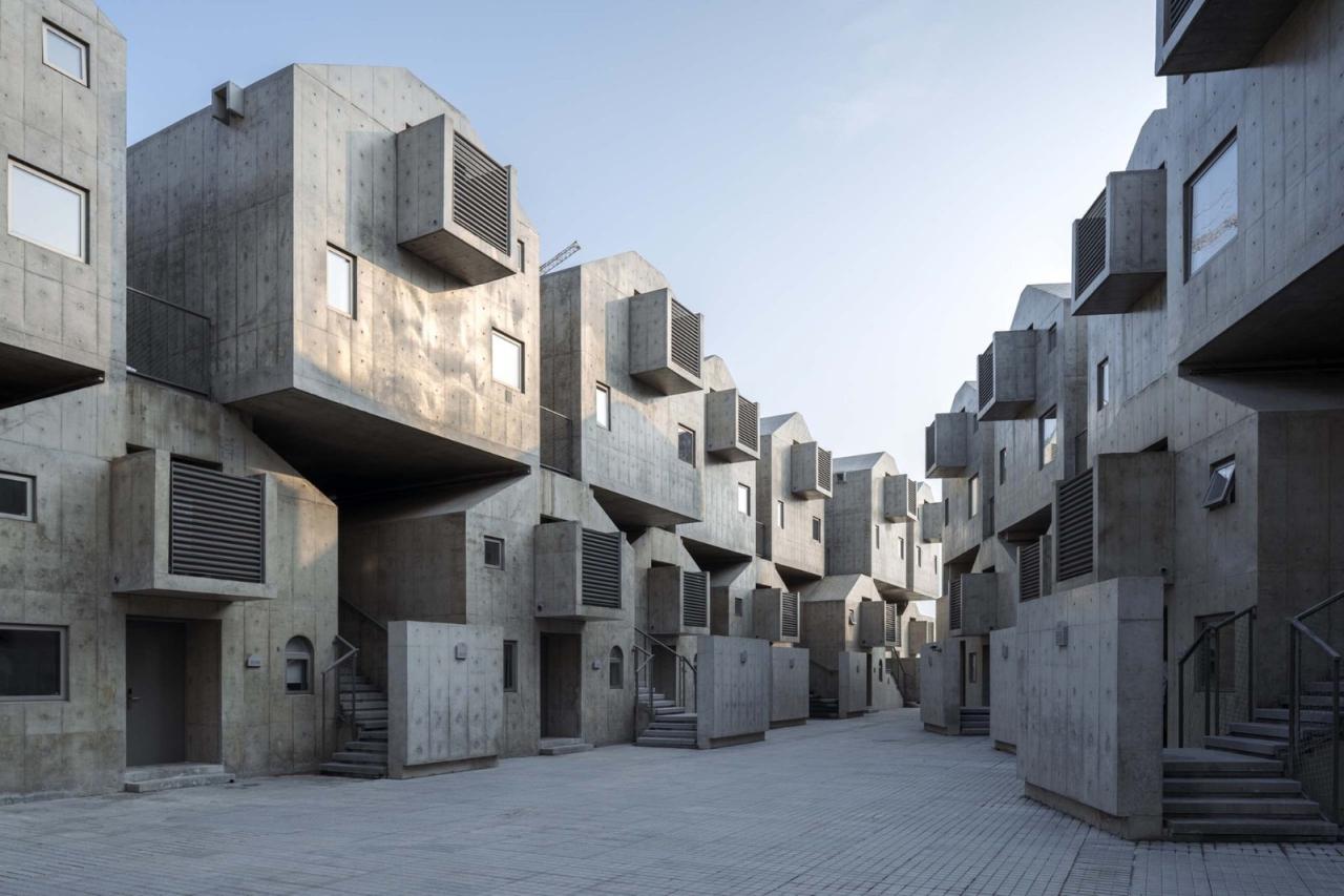 后来综合两种模式的特点设计出了一种错开的叠合模式,上下一共三十个盒子,出入口互相独立分开,这样除了解决了这个狗和狗的过多相遇的问题之外,还创造了非常不同的建筑造型,同时拉开的房子之间处理成楼梯并提供地下室食堂的自然采光。在盒子另一侧,因为有进有退,所以部分客房为了避让楼梯就产生了跌级的立面造型,同时也为客房室内的跃层楼梯提供了基本骨架。