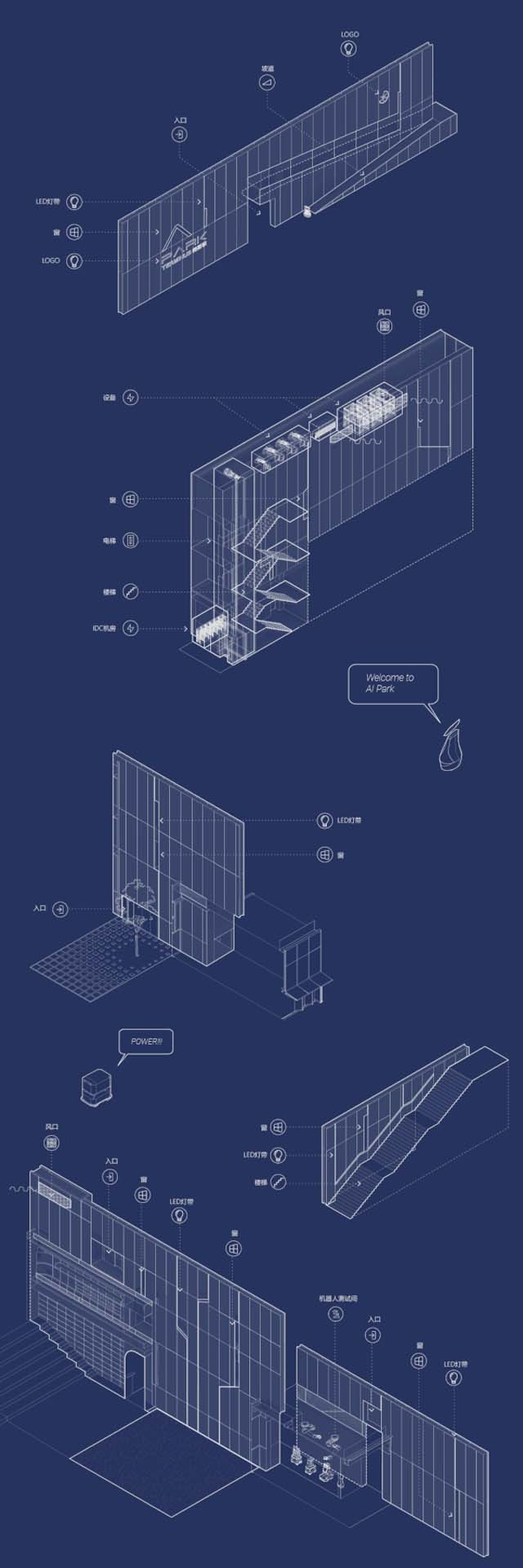 AI PARK 是 XINGDESIGN 行之建筑事务所为特斯联科技集团(TERMINUS GROUP)打造的人工智能城市先行区。作为中国科技赛道的独角兽,特斯联致力于推动城市智能化建设,做全球领先的智慧场景服务商。AI PARK 作为特斯联未来之城 AI CITY 的“序章”,是一个未来城市体验、研发测试、以及人与机器人交互的实验基地