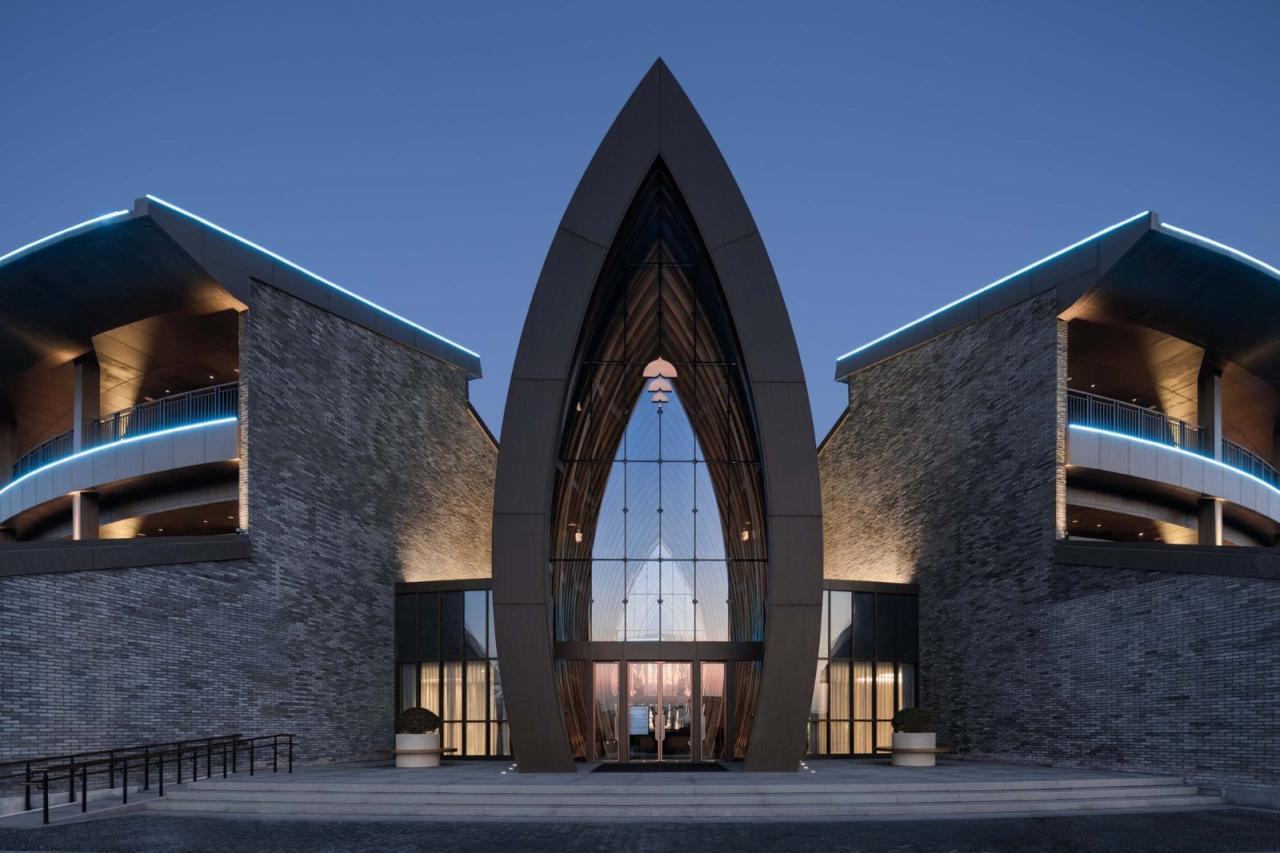 西侧部分将中部填充,形成一个大尺度的无柱会议空间,而东侧则将中部开敞,形成圆形的内部庭院,沿周边布置酒店客房。两个部分统一在一个连续完整的形态下,形成了虚实相生的建筑形象。中部连接的内凹部分,恰好设置为地下车库的出入口和设备机房。两部分主要功能既相关又独立。在一个连续曲线的环绕下,呈现出一致的外部形态。蜿蜒的屋顶采用了周边乡村常用的灰瓦屋面,传统的施工方式在这个新的几何形状上,营造出一种时间的累积效果。外部所有的装饰构件都采用深咖啡色,这也是来自于传统建筑的木作色调。