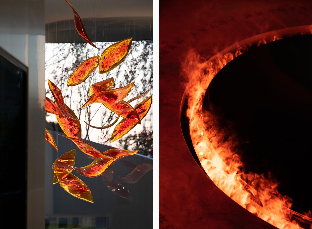 我们设计了一个围炉的场景,抬起的座台围合出一个椭圆形区域,形式上与窗外的景墙形成呼应,几何中心放置一个大理石原石火盆,用灯光与雾化装置模拟火焰,从天花挂落而下的艺术装置由进口树脂渐变染色并手工压制成型,象征着半空中升腾的火焰。