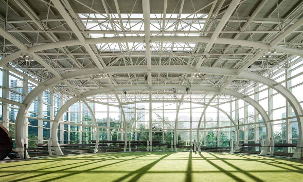 室内的绿意更添空间灵动,层层日光洒下,白色框架蜿蜒流动,颇有“虽由人作,宛自天开”的意味。“内庭园林”中不乏感性的文化气息,绿植在禅意的白沙上投下阴影,时间缓缓而逝。