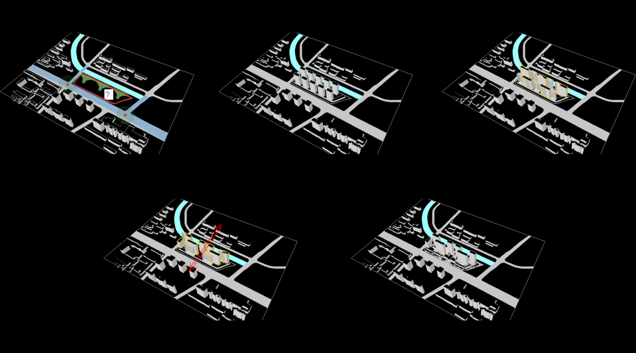 基地北侧临河,其余三面临路,为打造闹中取静之高端住区,我们采用纯粹的商住分离策略、将6栋住宅楼和临街商业及公寓完全脱离,同时楼栋之间错位布置,一方面保证户户看河、视线无遮挡,另一方面利用商业作为隔离带,进一步保证城市道路对住区的干扰最小化。