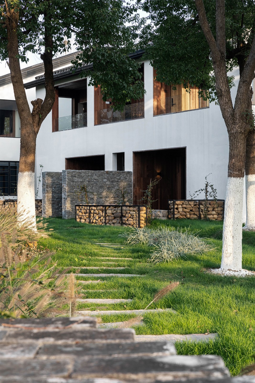 设计师通过阅读大量江淮地区的资料,从江淮地区的文化根源中获取灵感,根据当地自然气候的建造法则,以周围民居为原型进行设计。在设计过程中不局限于传统江淮建筑的外观、体量与尺度,重新组织建筑与庭院的关系,梳理动线,并根据空间新定义考虑的其使用需求,采用灵活的现代手法来丰富建筑与空间层次。